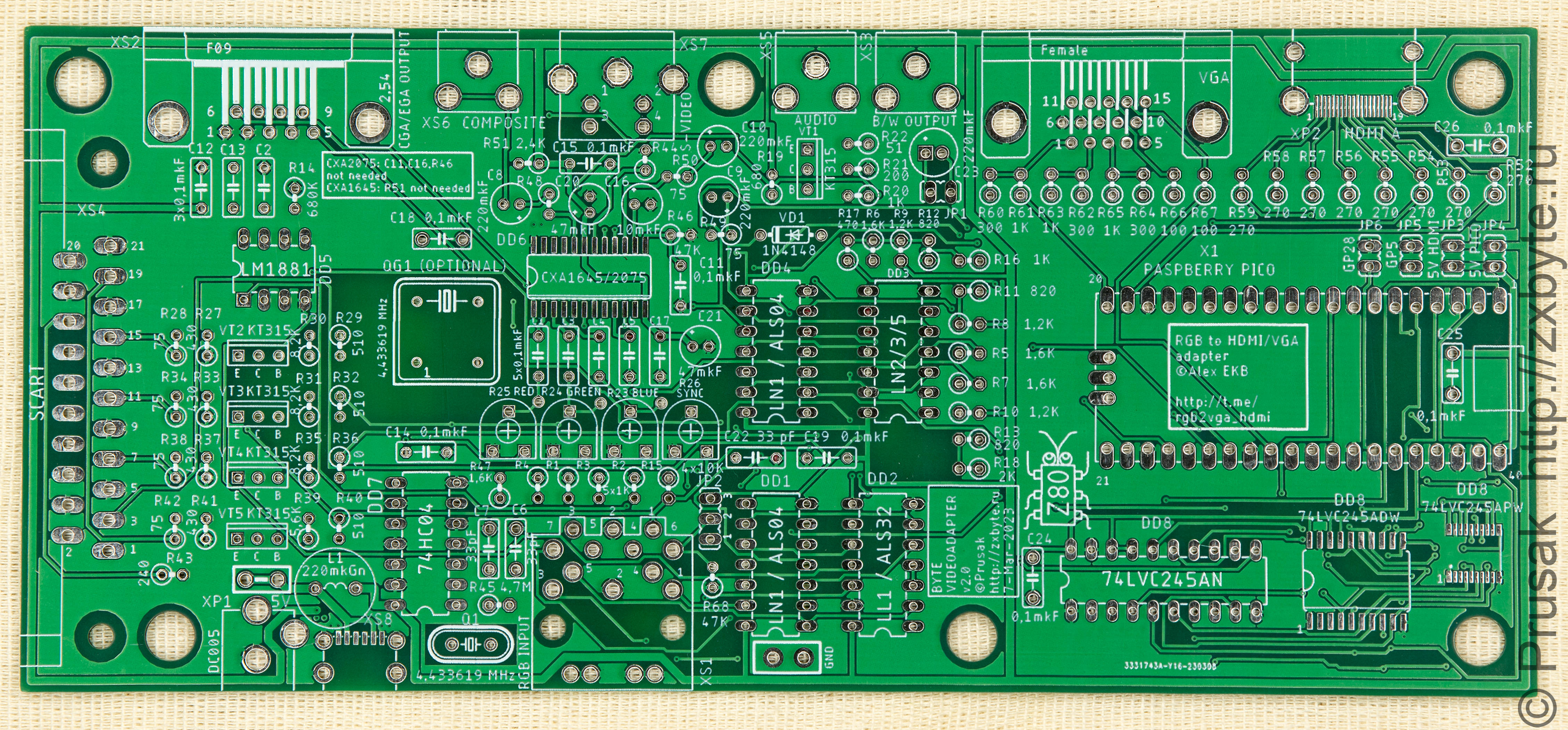 В случае, если будете собирать генератор на «рассыпухе», заказывайте элементы Q1 (4,433619 МГц), DD7 (К561ЛН2, 74HC04), C6,C7 (33 пФ), R45 (4,7М), R47 (1,6К).