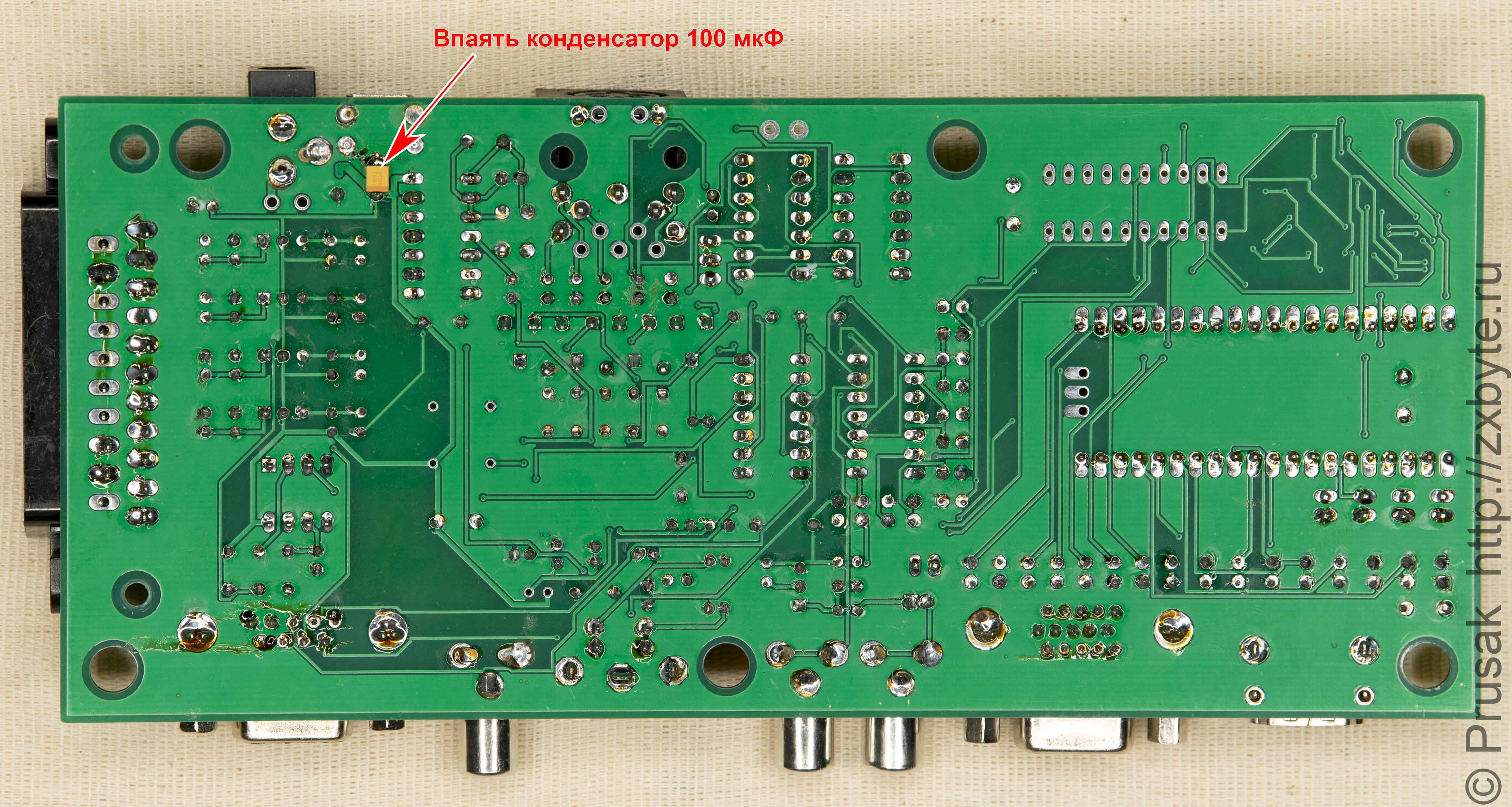 Для уменьшения влияния ВЧ-помех при питании адаптера от импульсных источников питания имеет смысл установить дополнительный конденсатор ёмкостью порядка 100 мкФ в указанное место платы: