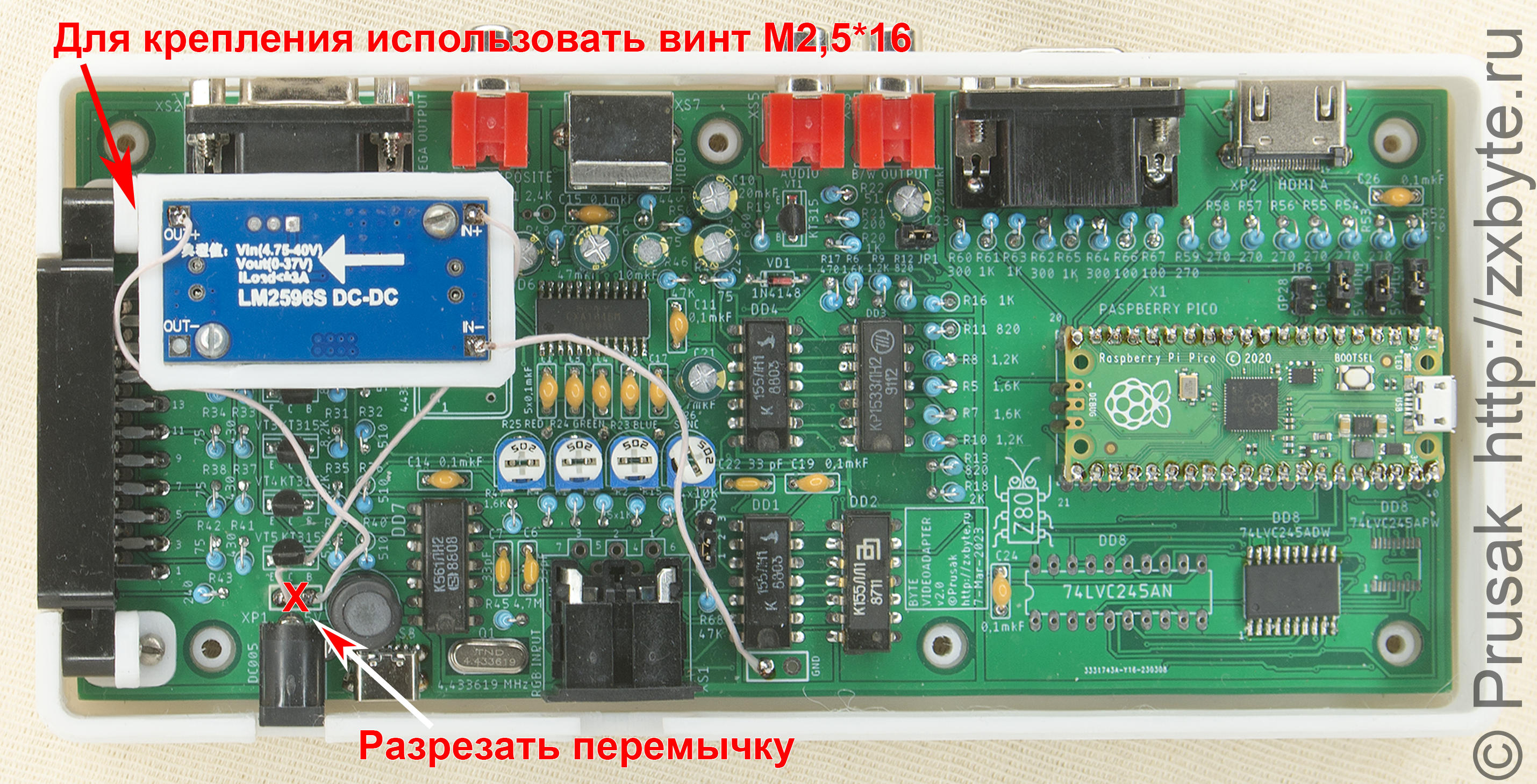 Чтобы подключить преобразователь в схему адаптера нужно разрезать одну перемычку и припаять провода как на рисунке выше.