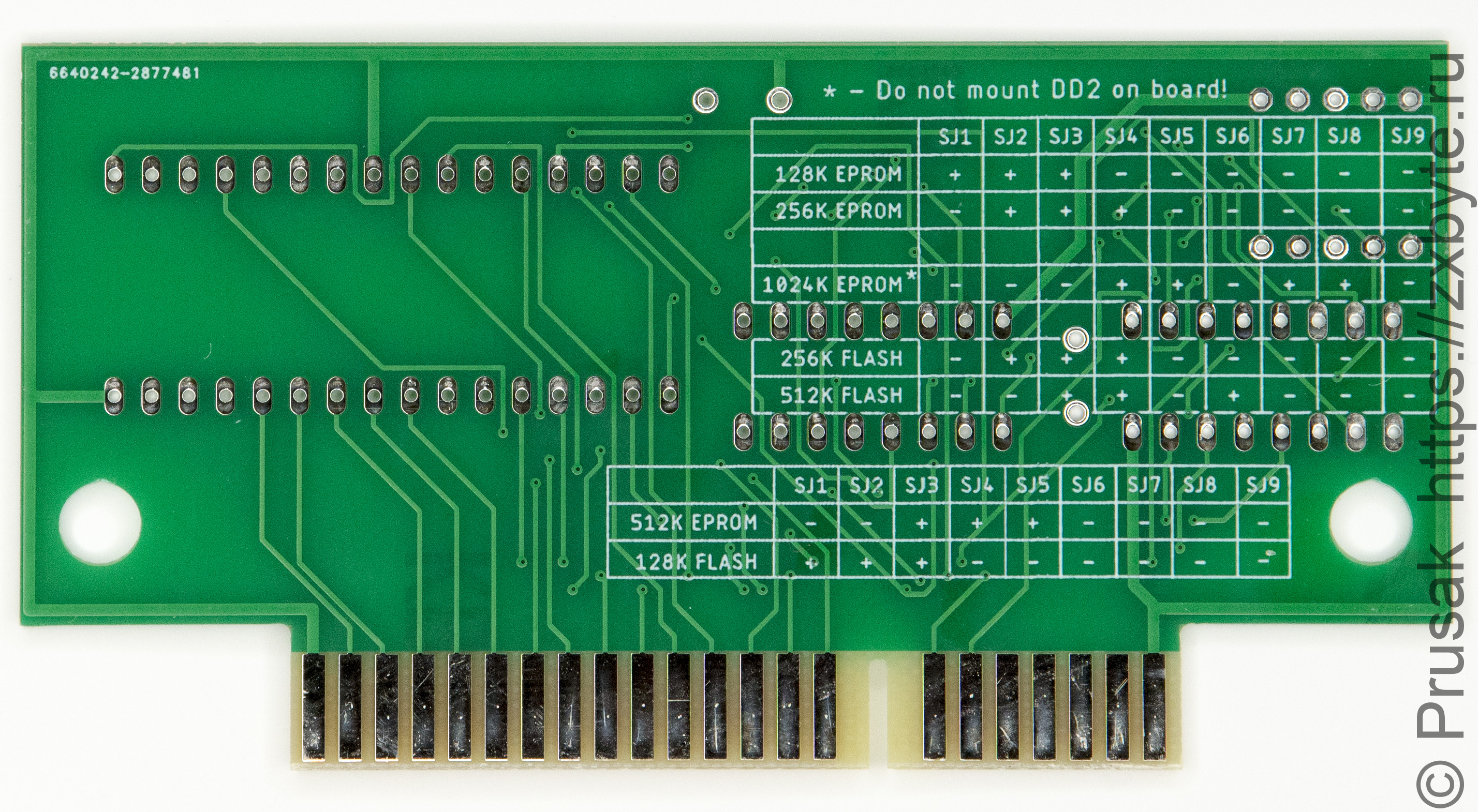 Плата картриджа рассчитана на использование микросхемы ПЗУ или FLASH в DIP-корпусе и объёмом от 128К и выше. В зависимости от объёма и типа микросхемы на плате замыкаются соответствующие перемычки в соответствии с таблицей: