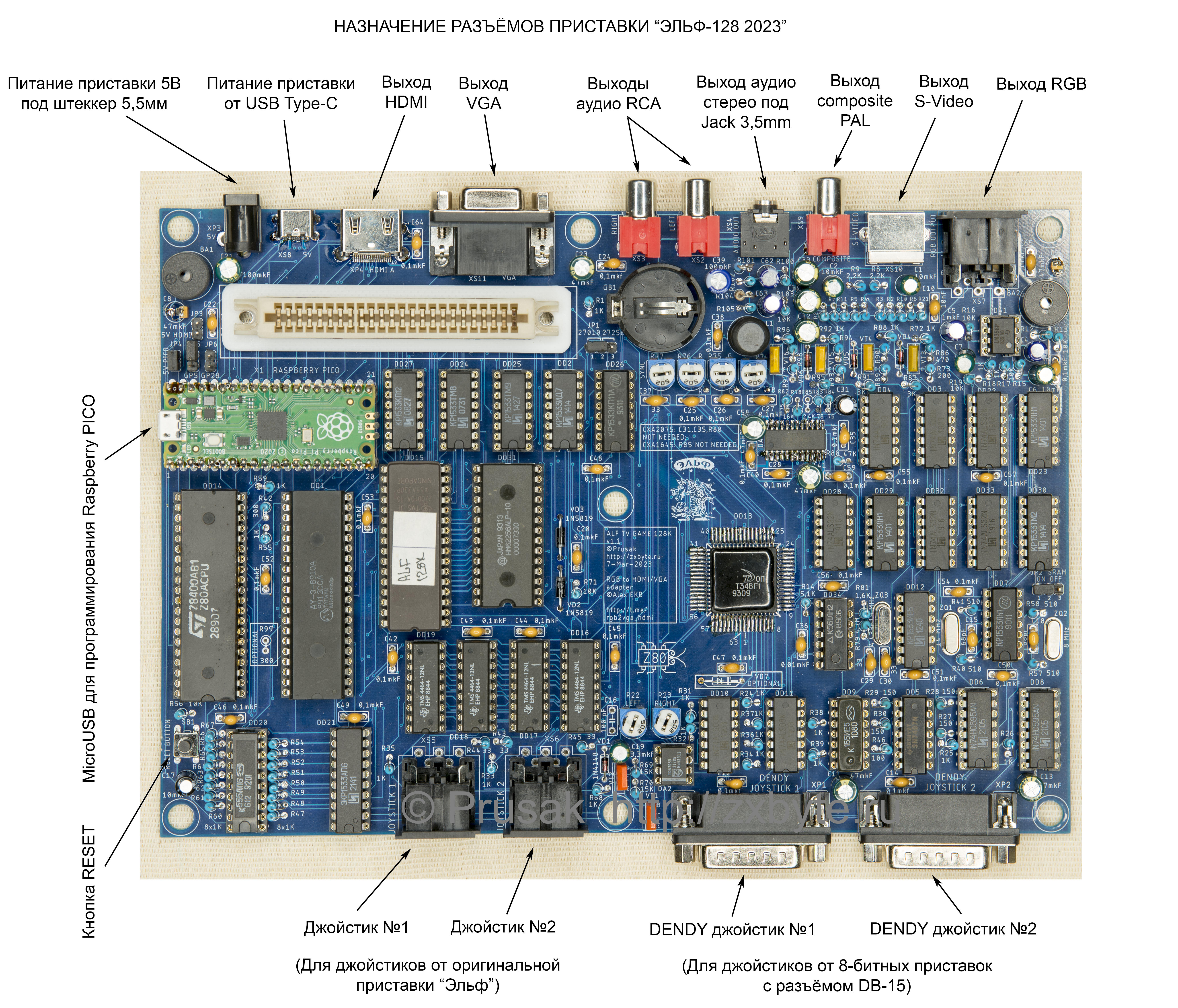 - RGB выход по распиновке как в оригинальной приставке «Эльф», но с возможностью подключения к SCART без согласования уровней сигнала;