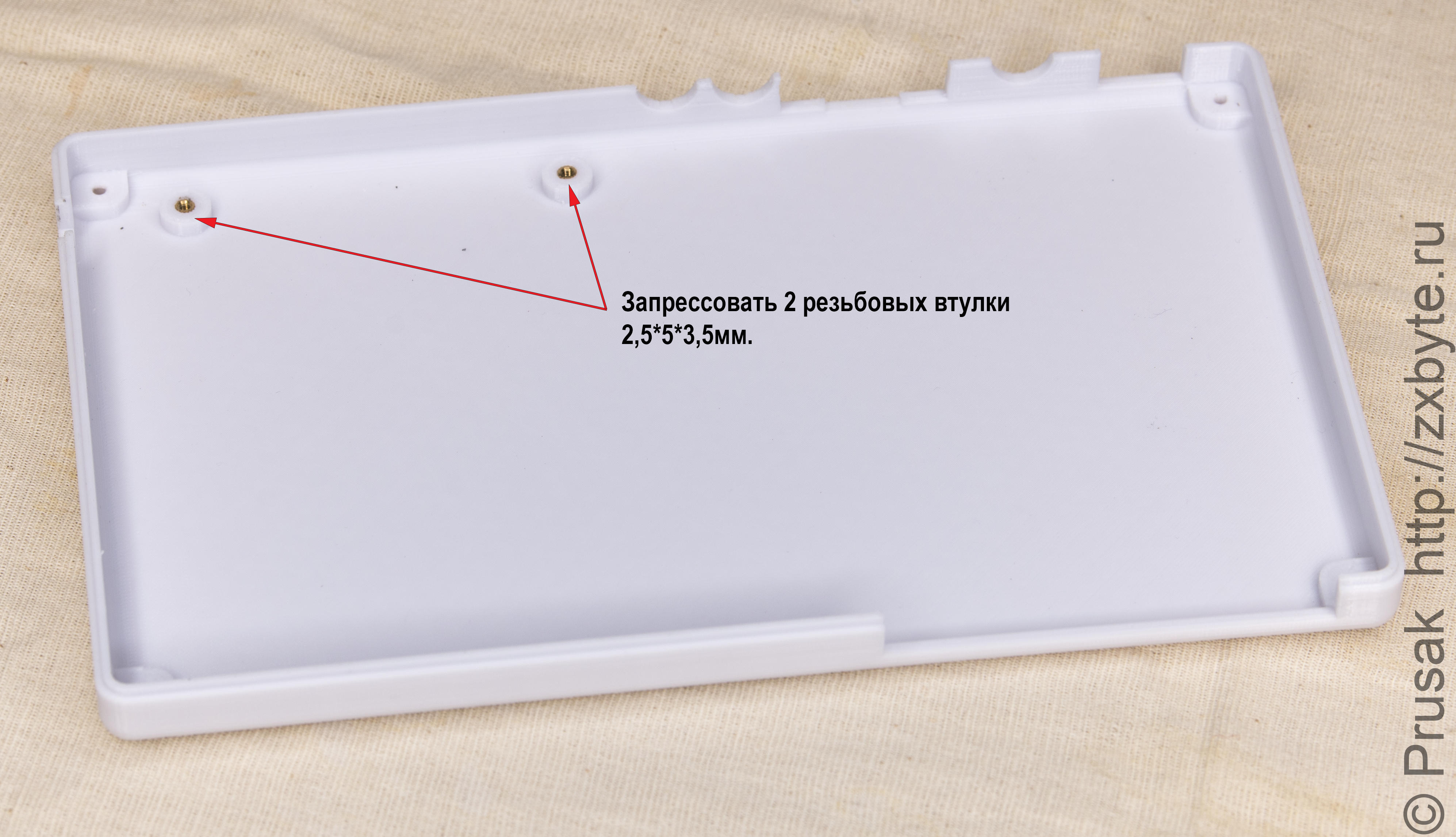 2) Печатаем нижнюю часть корпуса и запрессовываем в неё 2 резьбовые втулки 2,5x5x3,5мм (я покупал на Aliexpress оптом);