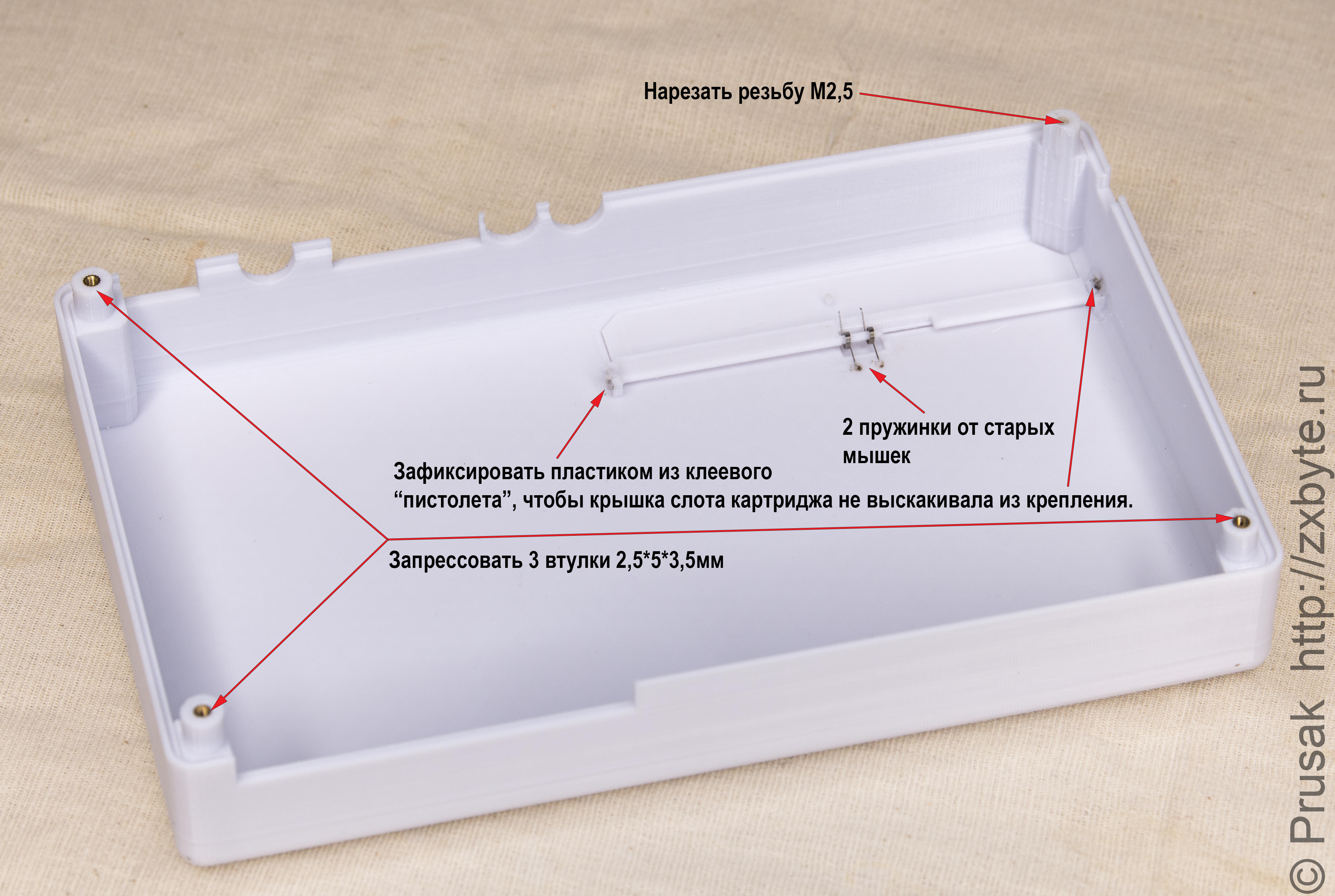 9) Вставляем крышку слота картриджа в "ушки", расположенные на верхней части корпуса. Возможно придётся расширить паз, чтобы ось крышки слота картриджа пролезла внутрь "ушка". Чтобы крышка слота картриджа сама закрывалась, я использовал две пружинки от старых мышек с колёсиком. После установки прожинок и проверки, чтобы крышка слота нормально открывалась-закрывалась, паз в «ушке» можно залить пластмассой из клеевого пистолета, чтобы крышка потом сама не выскочила из паза: