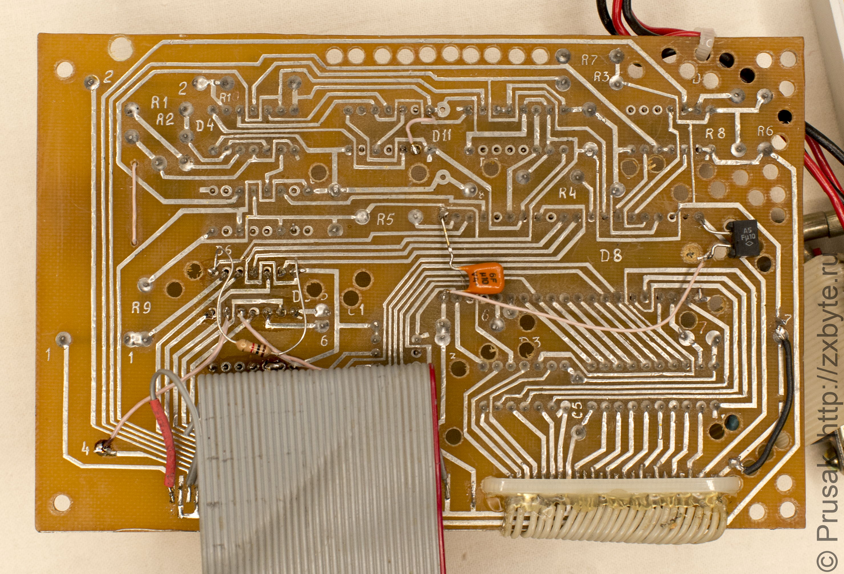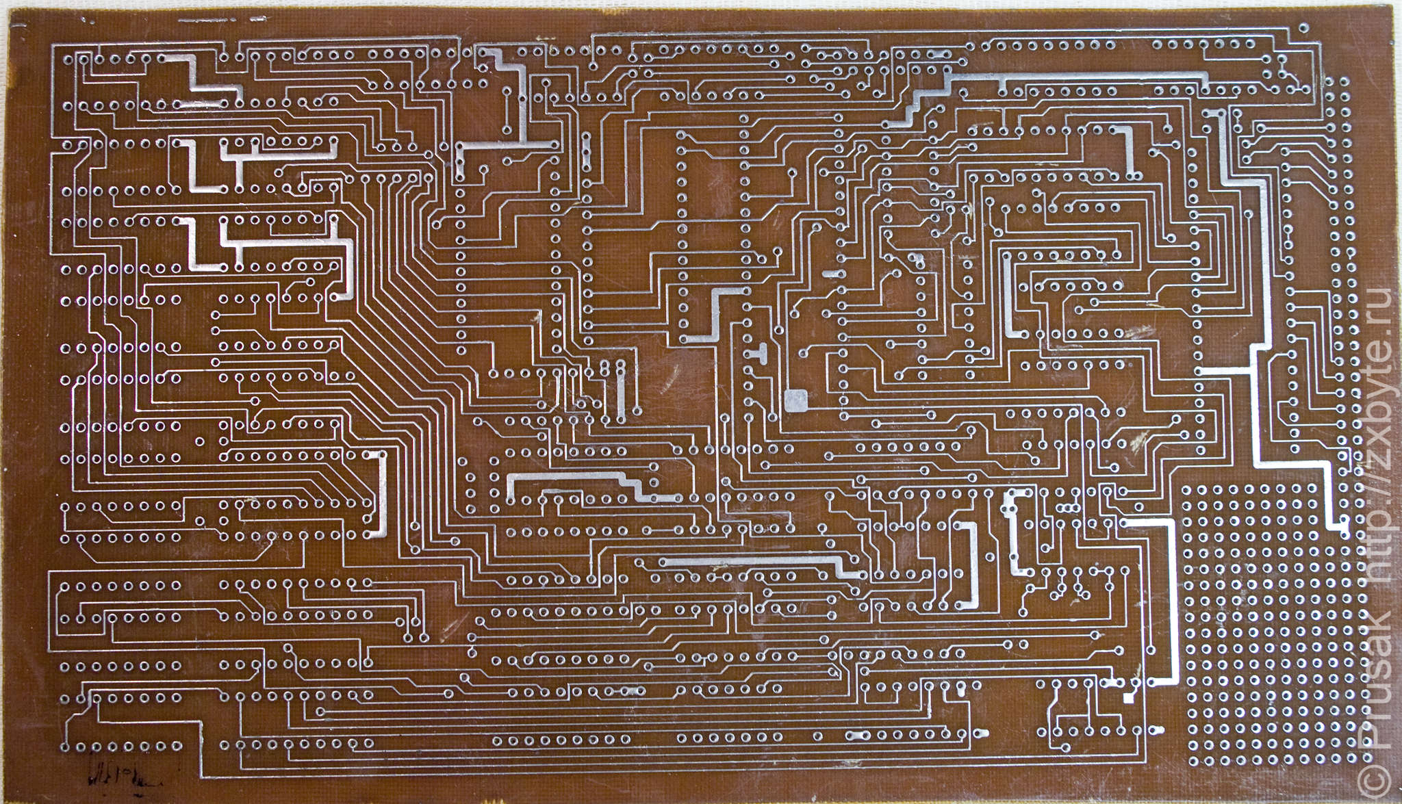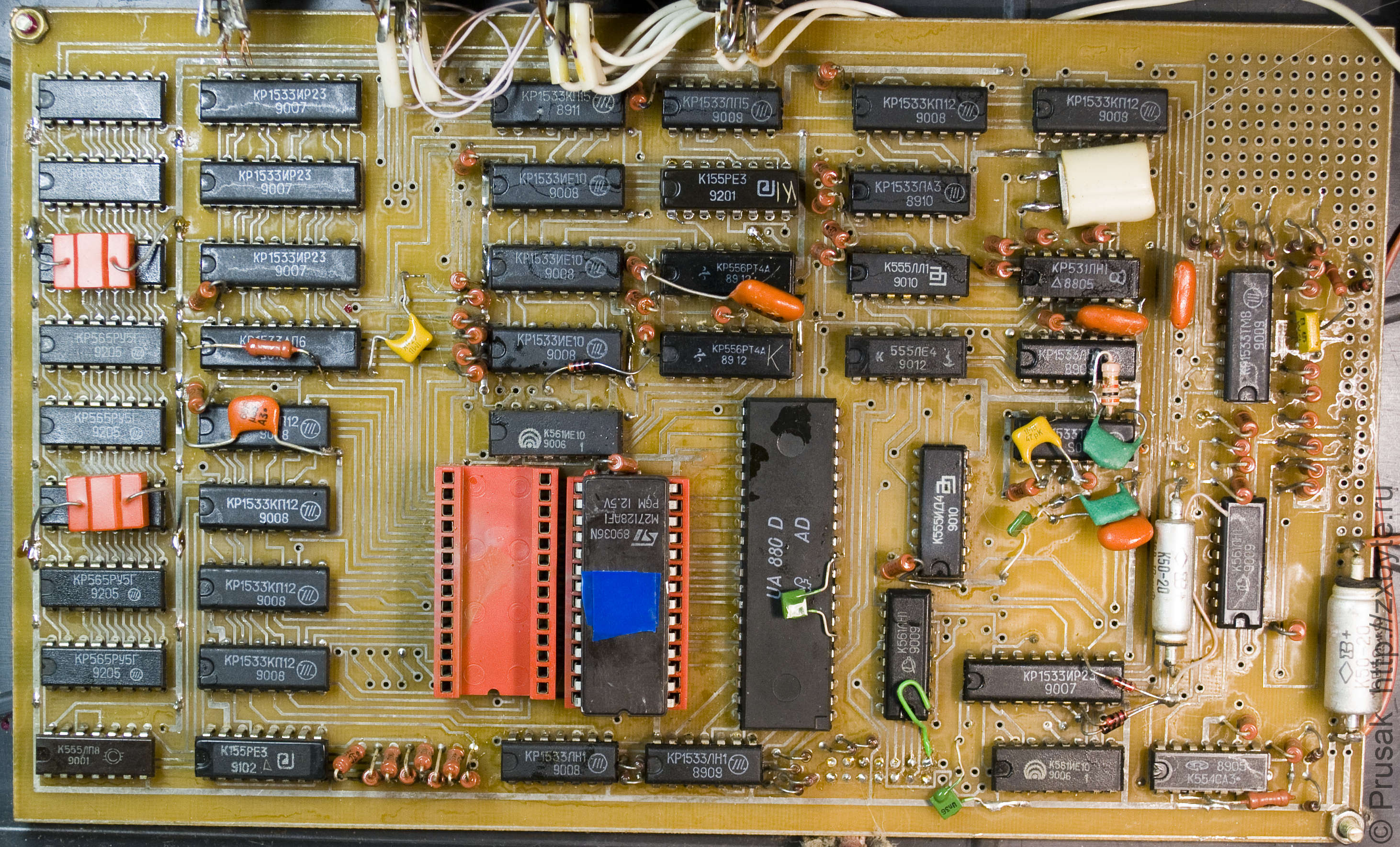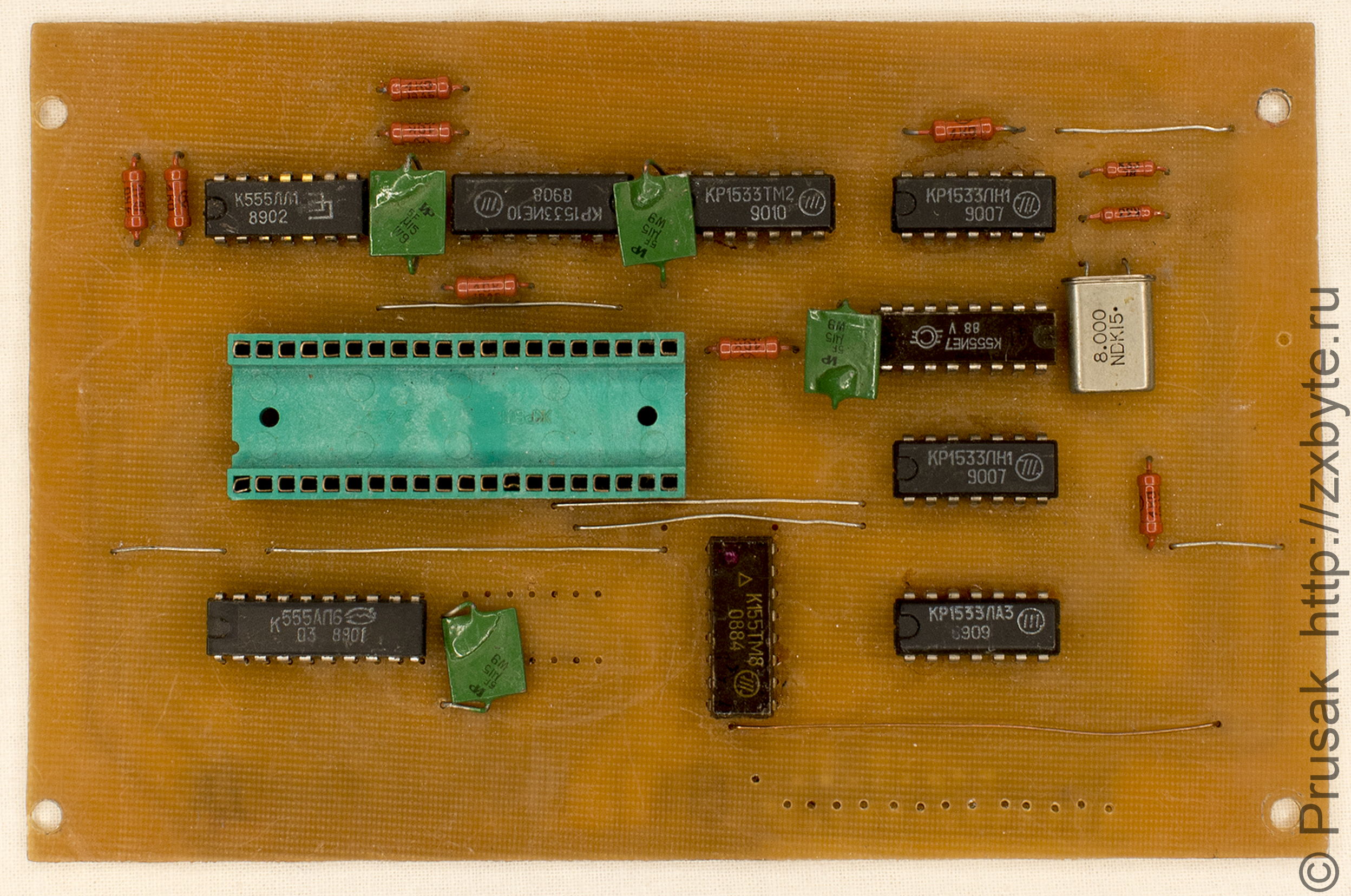 Звернеце ўвагу на амаль поўную адсутнасць блакавальных кандэнсатараў на плаце і на тое, што гэтая плата без раўналежнага порта на КР580ВВ55 (на яе месцы знаходзіцца КР1533ТМ8 для фармавання відэавыхаду з градацыямі яркасці).