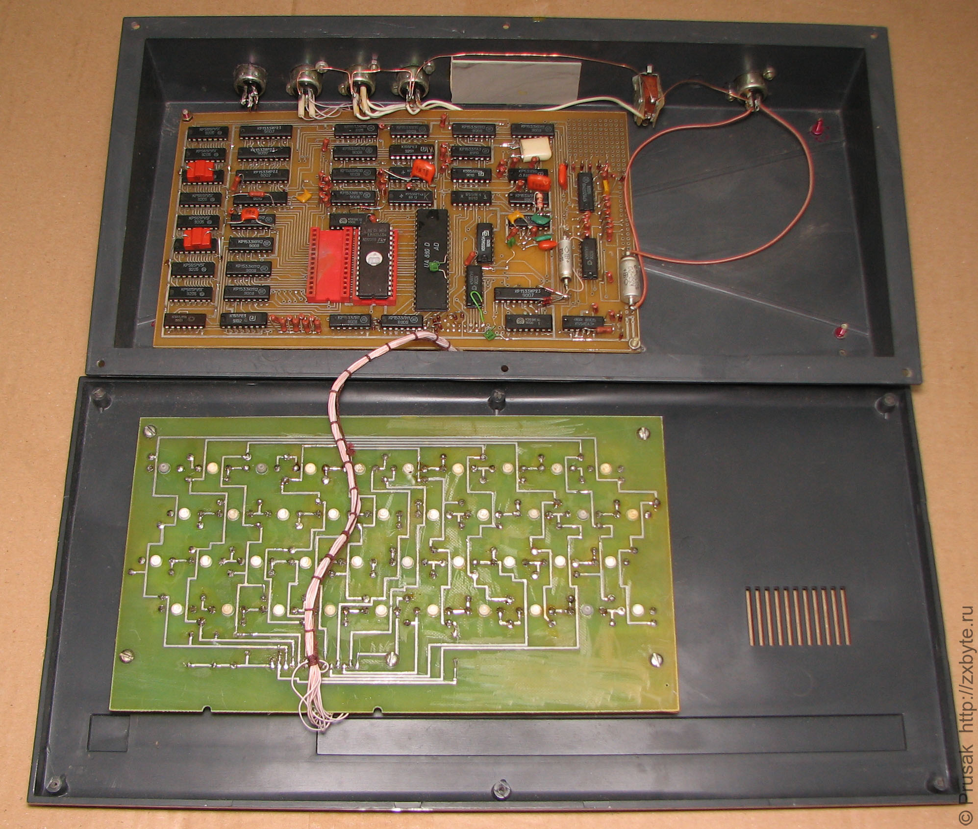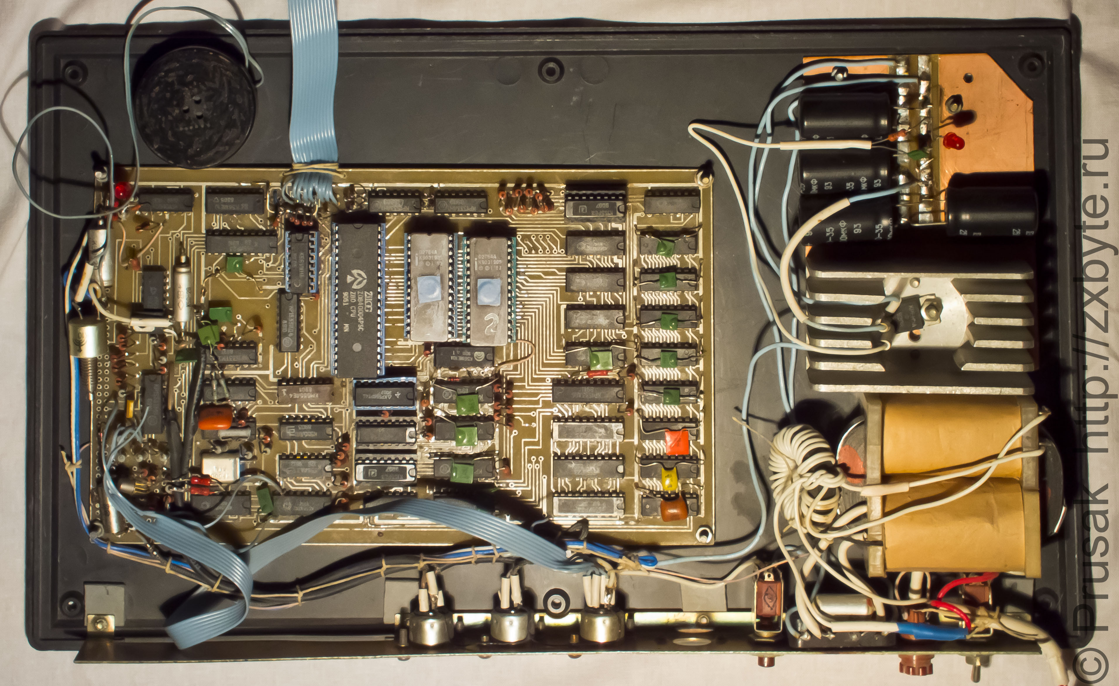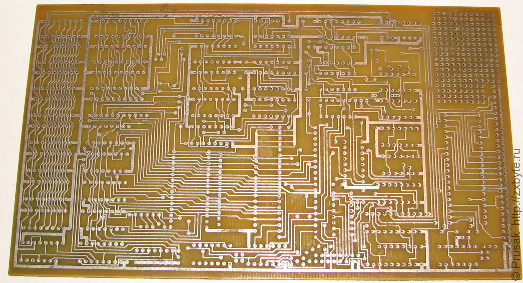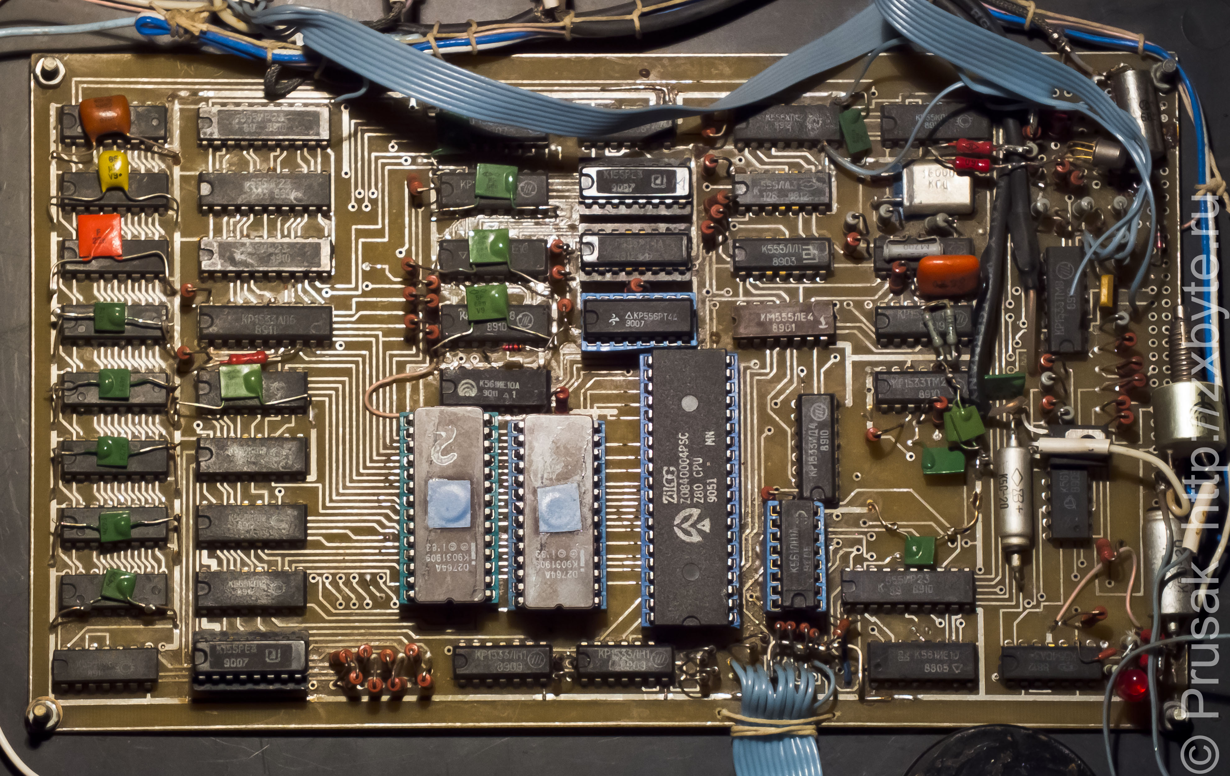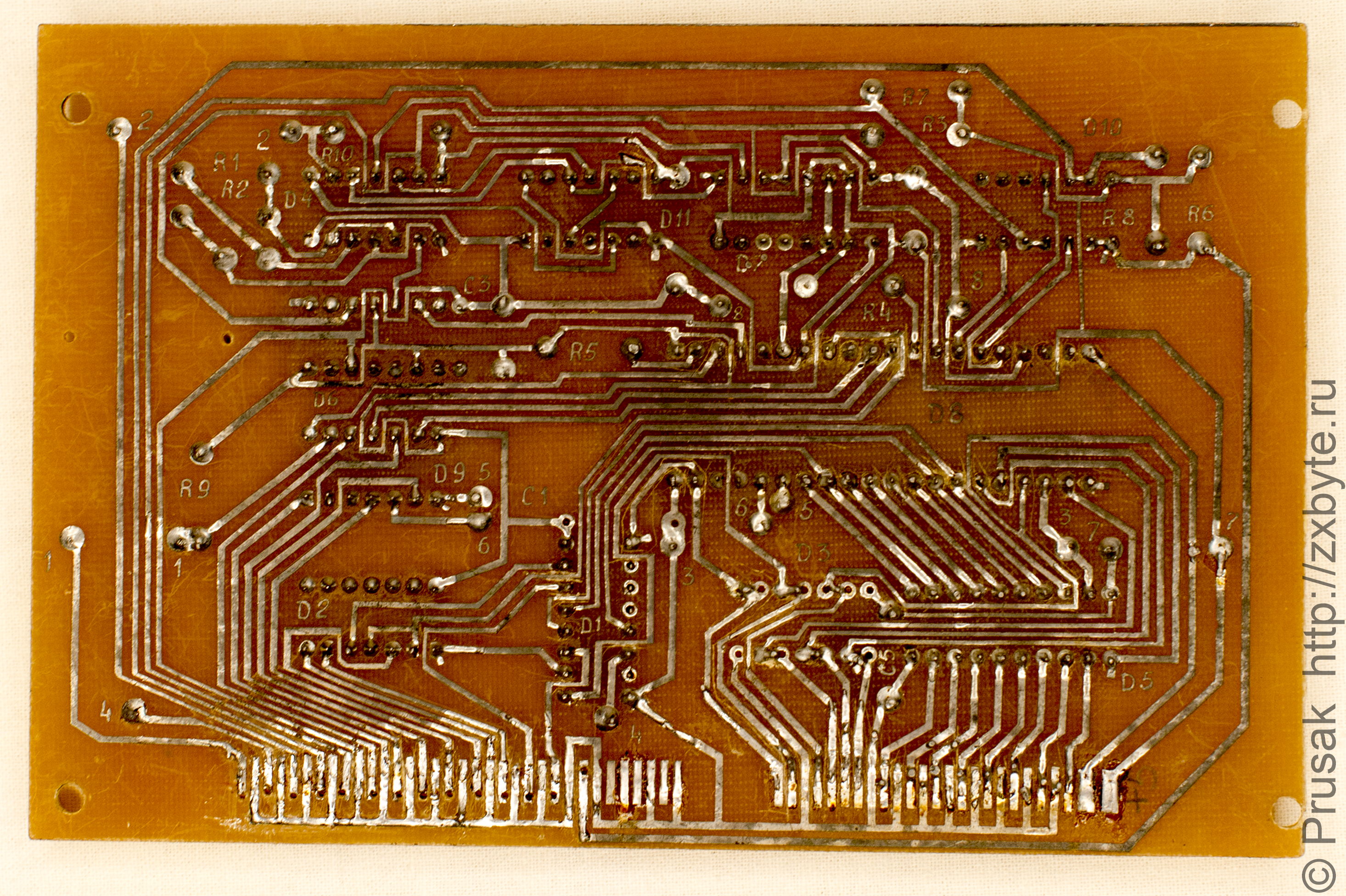 Звернеце ўвагу на амаль поўную адсутнасць блакавальных кандэнсатараў на плаце і на тое, што гэтая плата без раўналежнага порта на КР580ВВ55 (на яе месцы знаходзіцца КР1533ТМ8 для фармавання відэавыхаду з градацыямі яркасці).