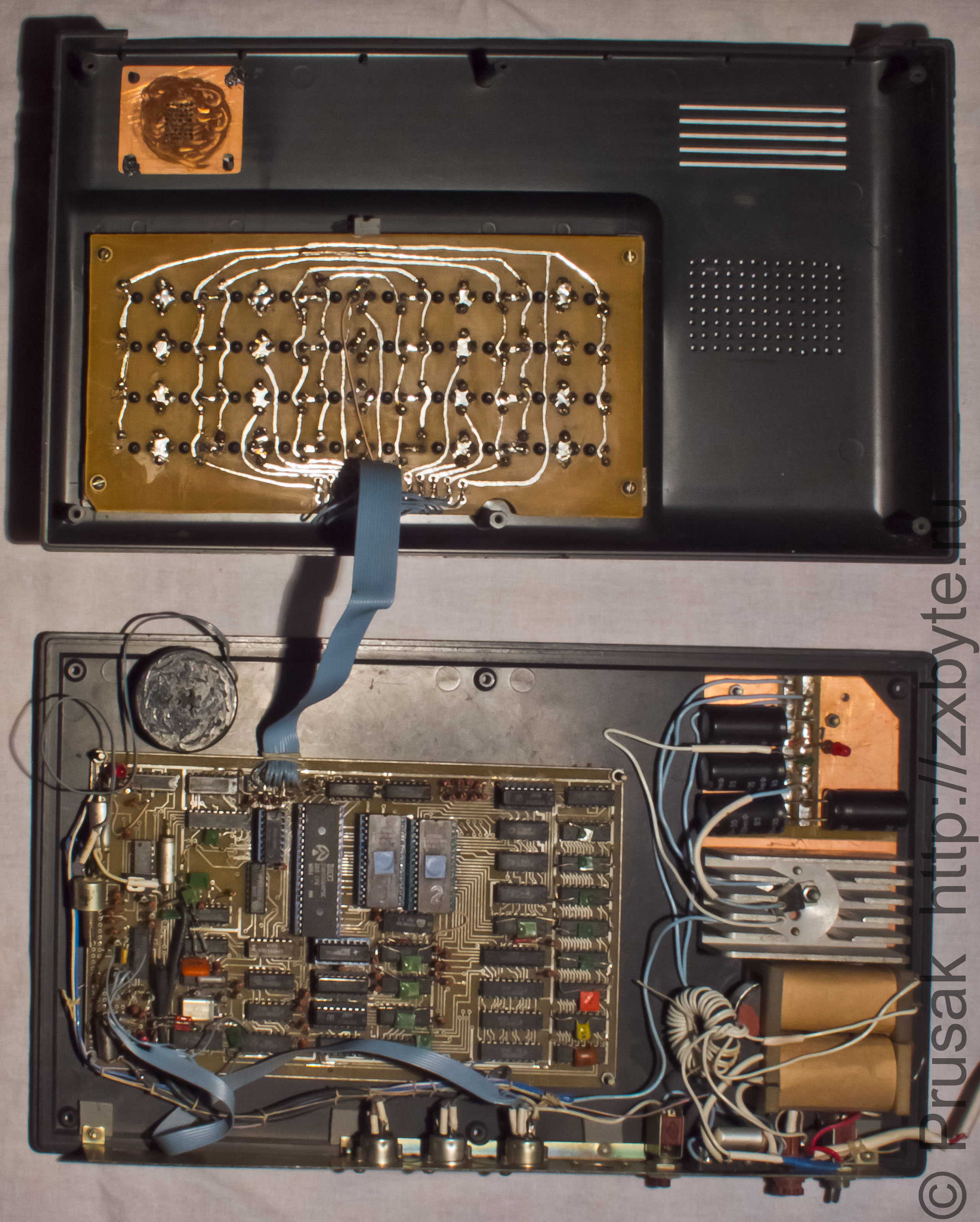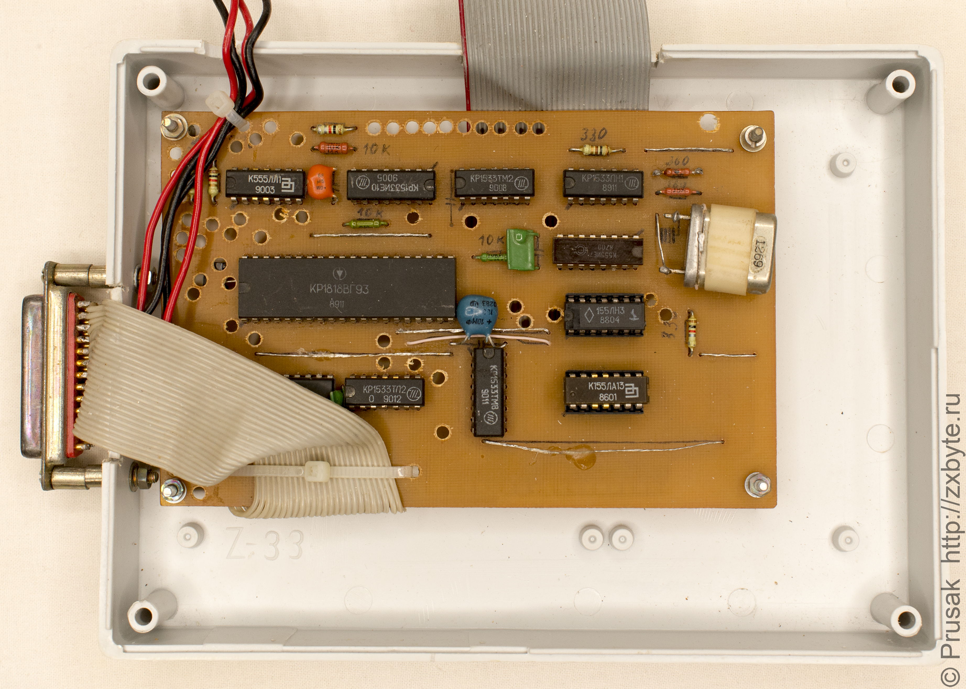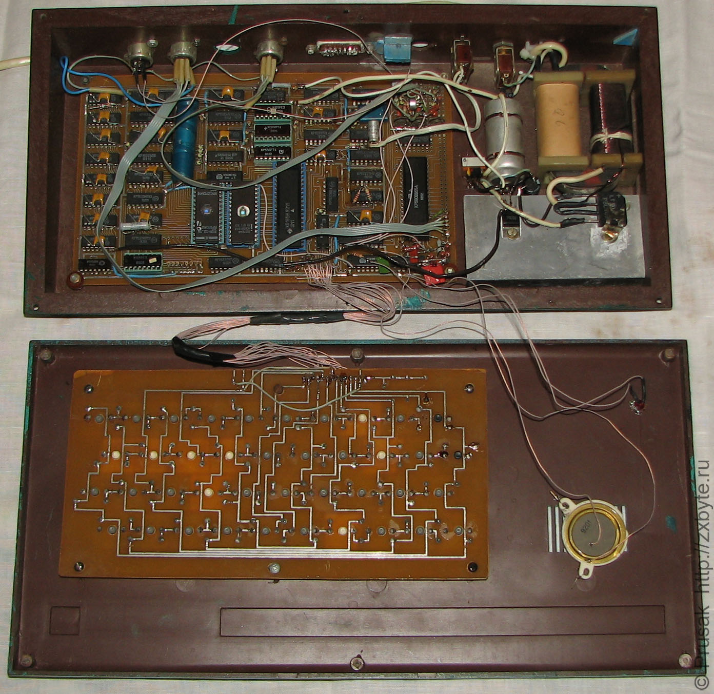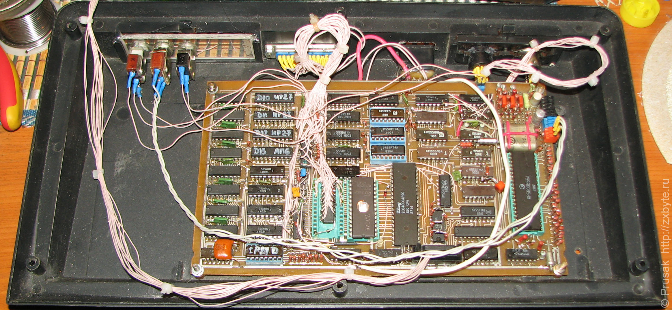 Звернеце ўвагу на амаль поўную адсутнасць блакавальных кандэнсатараў на плаце і на тое, што гэтая плата без раўналежнага порта на КР580ВВ55 (на яе месцы знаходзіцца КР1533ТМ8 для фармавання відэавыхаду з градацыямі яркасці).