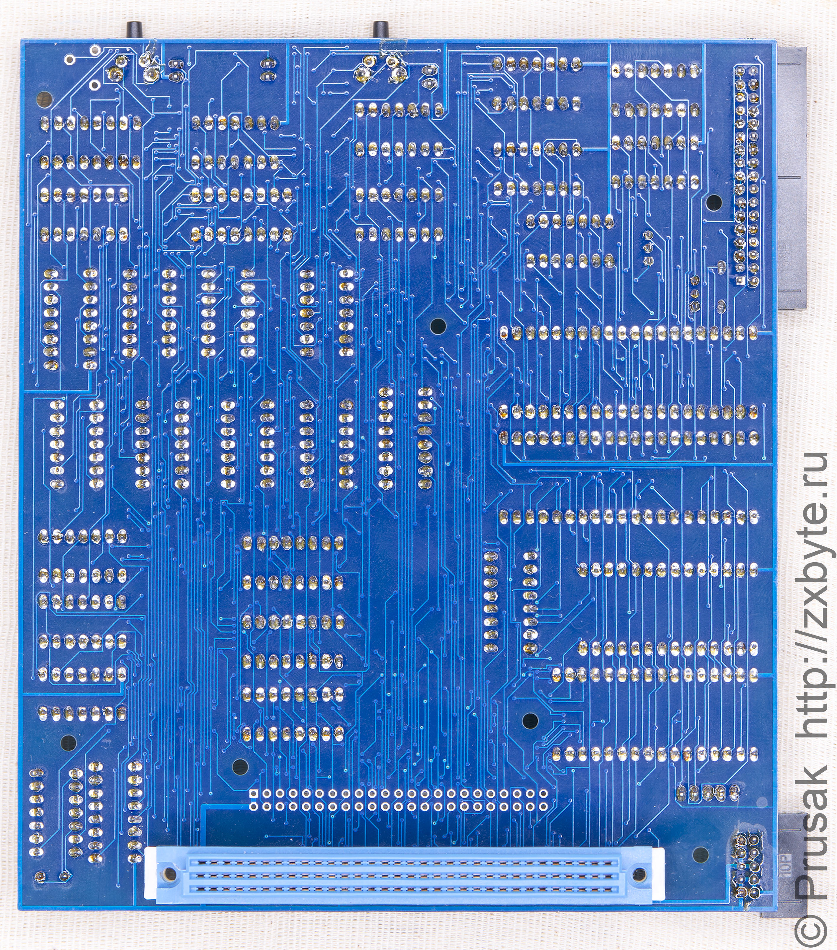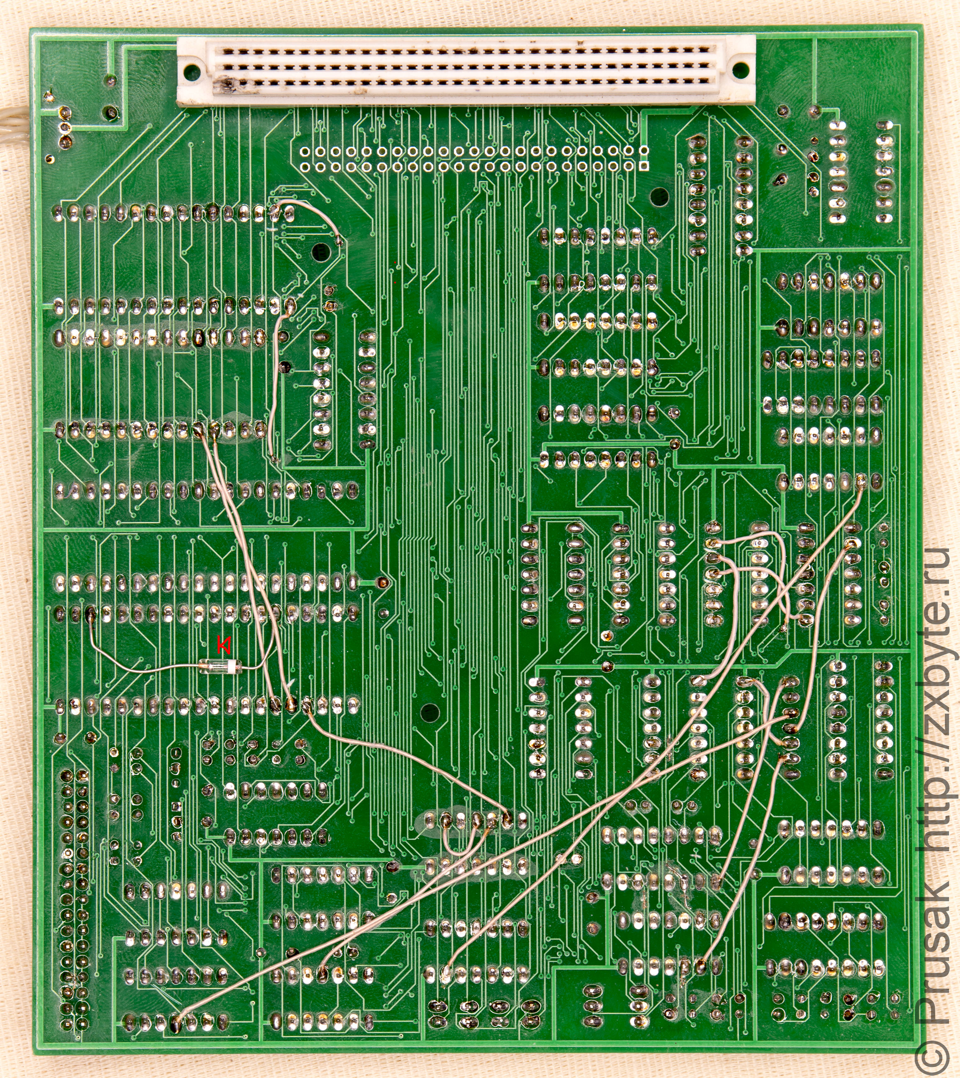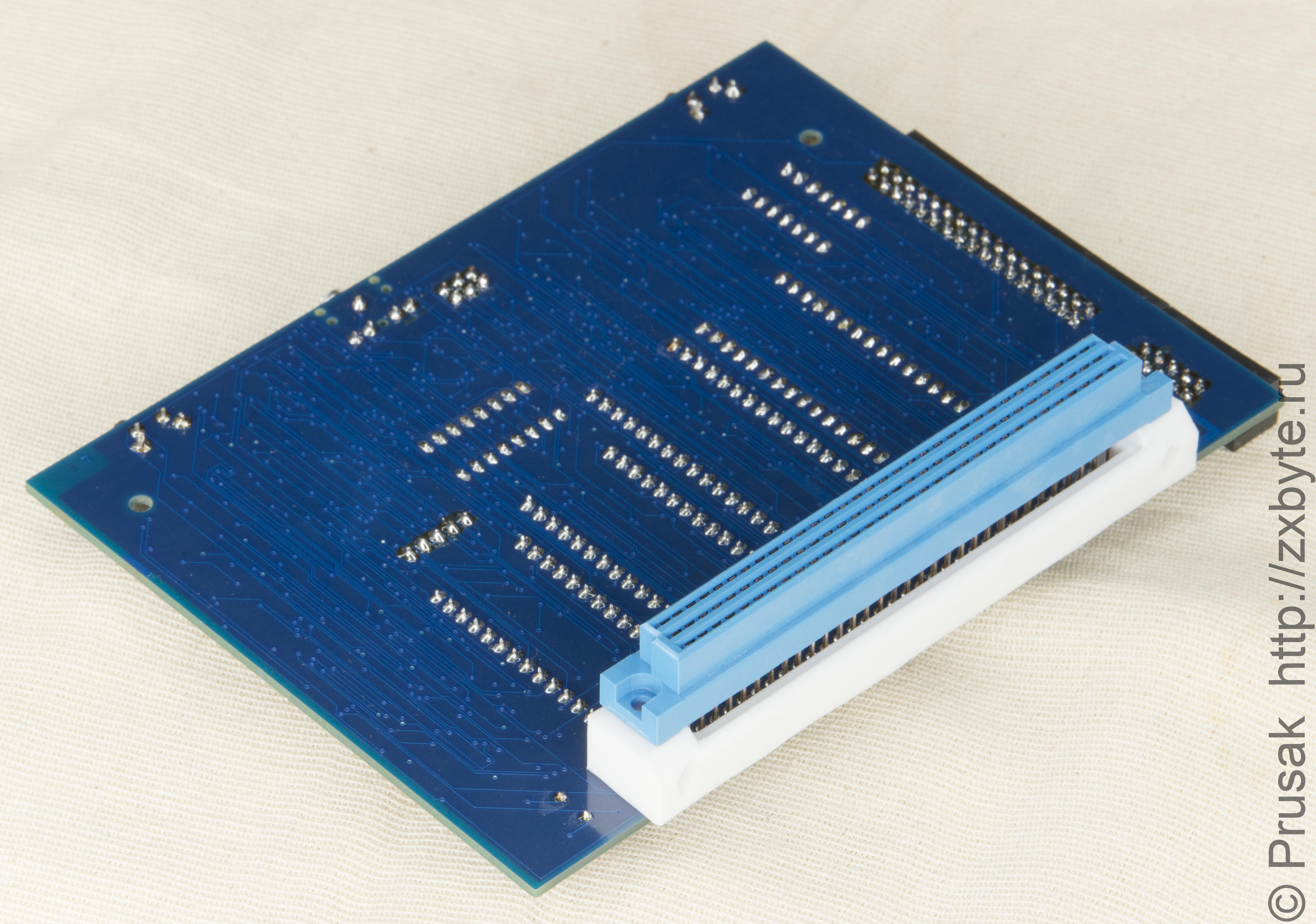 Ещё раз обращаю внимание на способ установки системного разъёма XS1 - он паяется с обратной стороны платы! Если не планируется использование корпуса, то разъём можно паять «впритык» к плате (можно сначала просто вставить разъём в плату (без пайки), всю эту конструкцию вставить в системный разъём «Байта» и прикинуть, чтобы корпус компьютера не задевал за плату контроллера). Если же для контроллера будет изготавливаться корпус, то про установку разъёма читайте чуть ниже по тексту раздела.