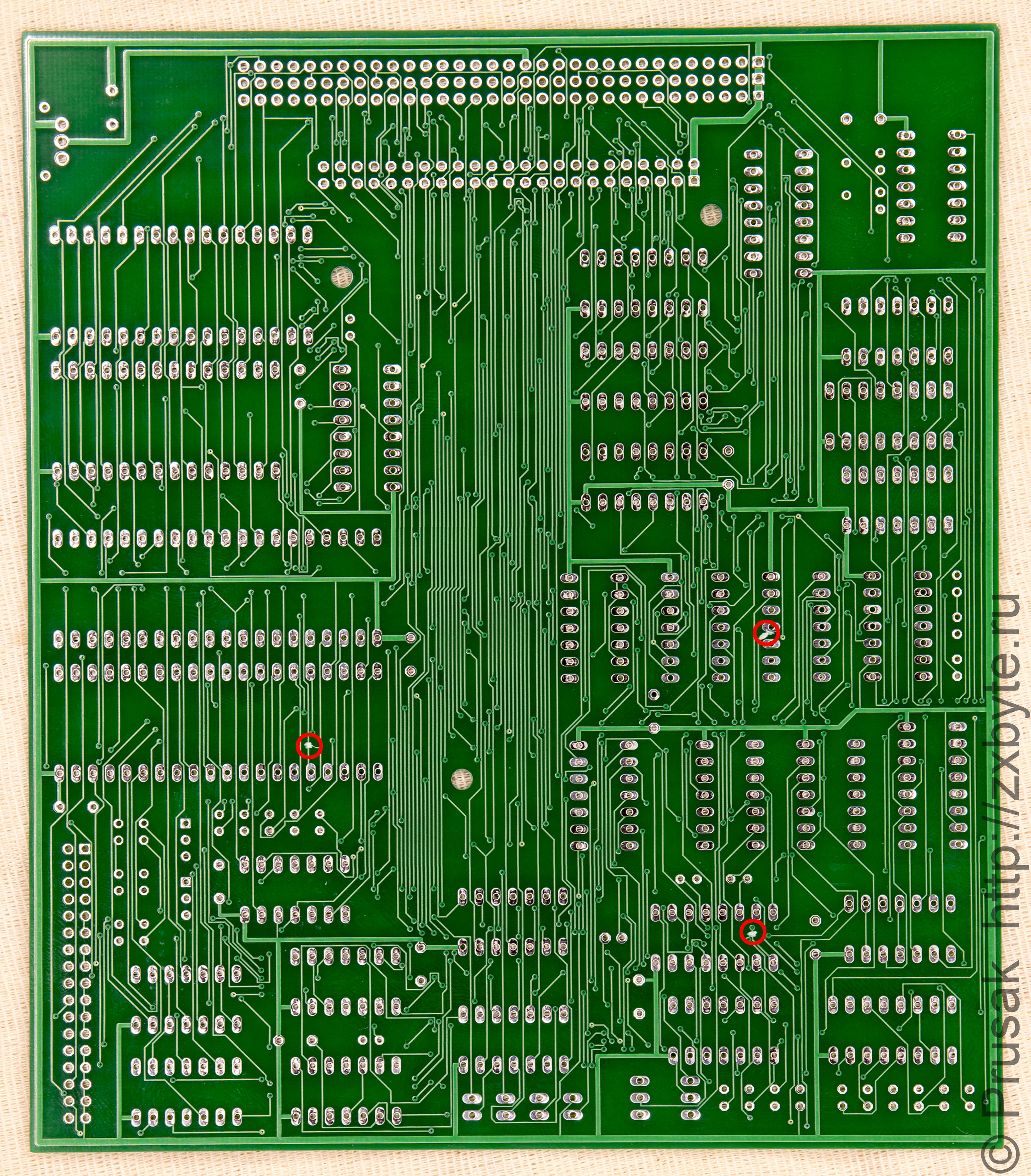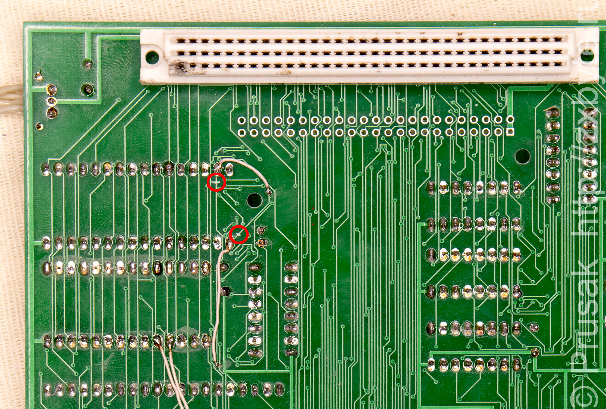 Доработка контроллера для использования ПЗУ в качестве ROM-диска. Красными кружками отмечены места разреза проводников.