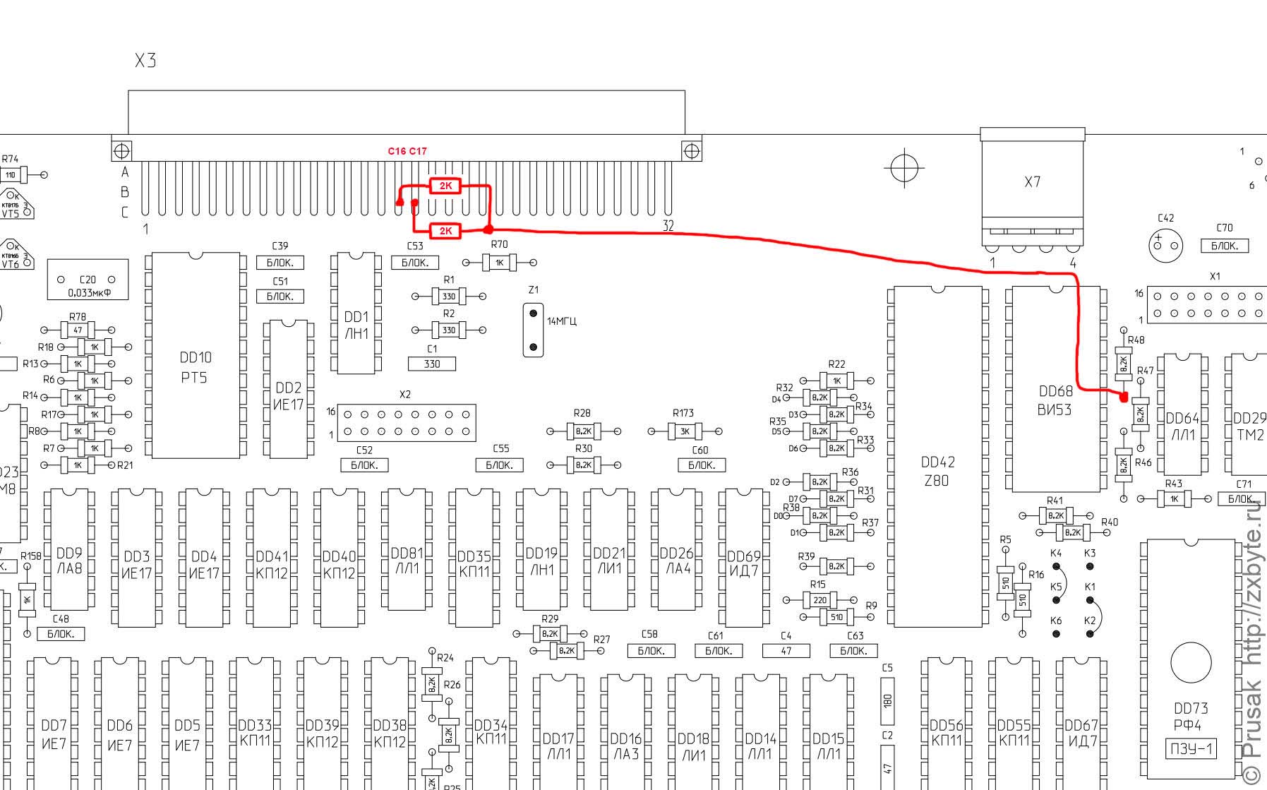 Пример установки доработанного ПЗУ объёмом 2КБ на место ПЗУ DD14 (на примере платы контроллера v3.2):