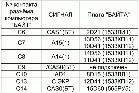 Необходимые для работы схемы расширения памяти сигналы подключаются к неиспользуемым в «Байте» контактам системного разъёма. Делаем согласно таблице: