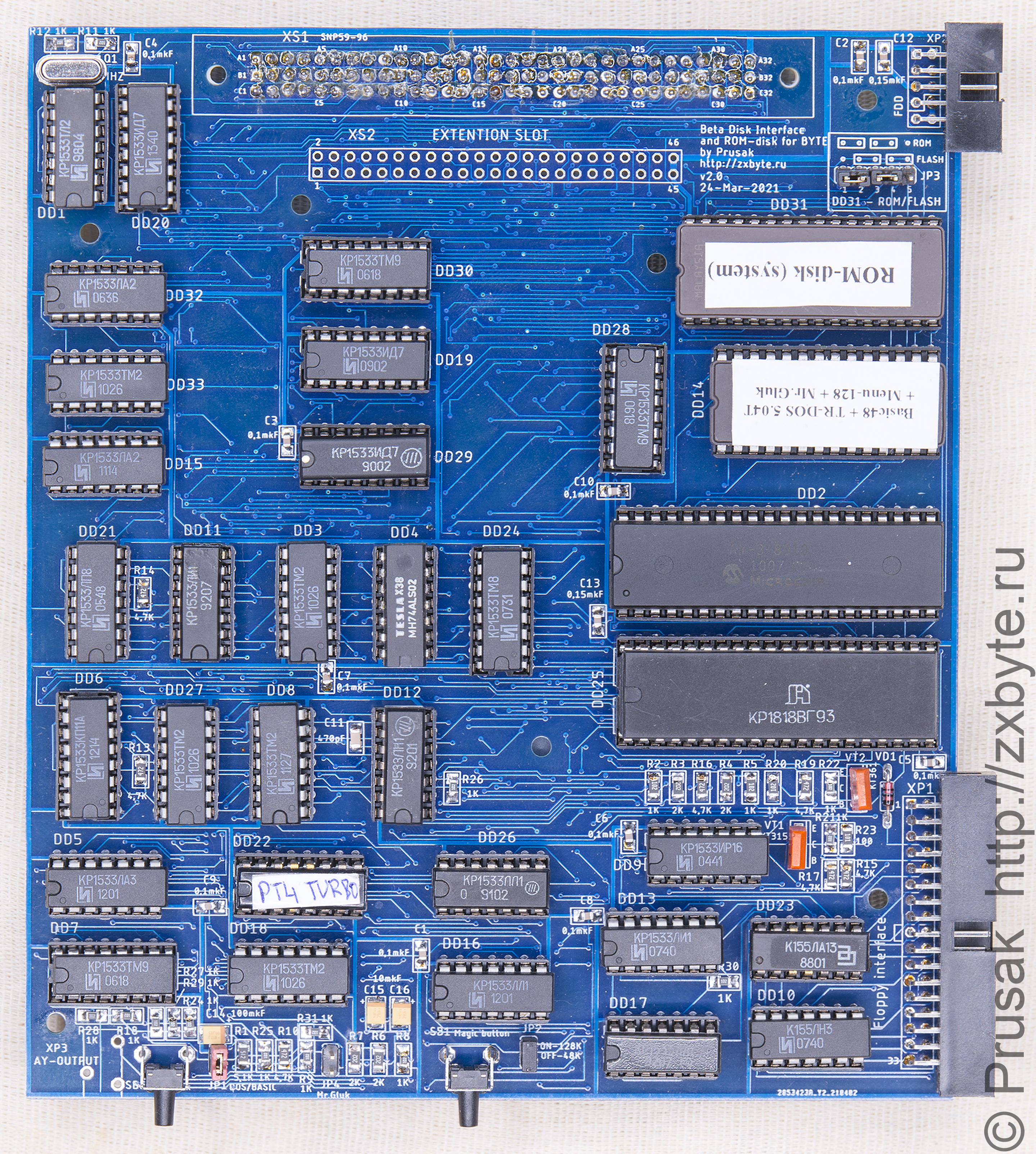 «Байт» необязательно расширять до 128К - и контроллер и ROM-диск будут отлично работать на обычном 48КБ «Байте». Равно как, если не нужен ROM-диск, можно не паять часть схемы, отвечающую за него (микросхемы DD29-DD32).