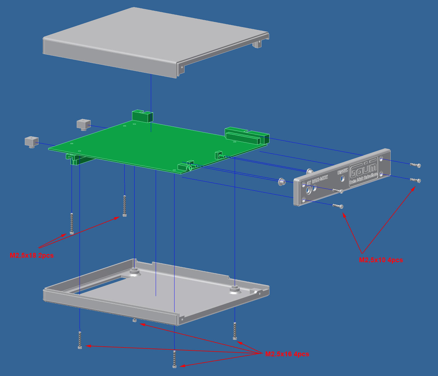 Для сборки корпуса потребуются винты М2,5 с круглой (ГОСТ 17473) или цилиндрической (ГОСТ 1491) головкой трёх типоразмеров - М2,5х10 (можно длиной 8 мм) (4 шт), М2,5х16 (4 шт) и М2,5х18 (2 шт):