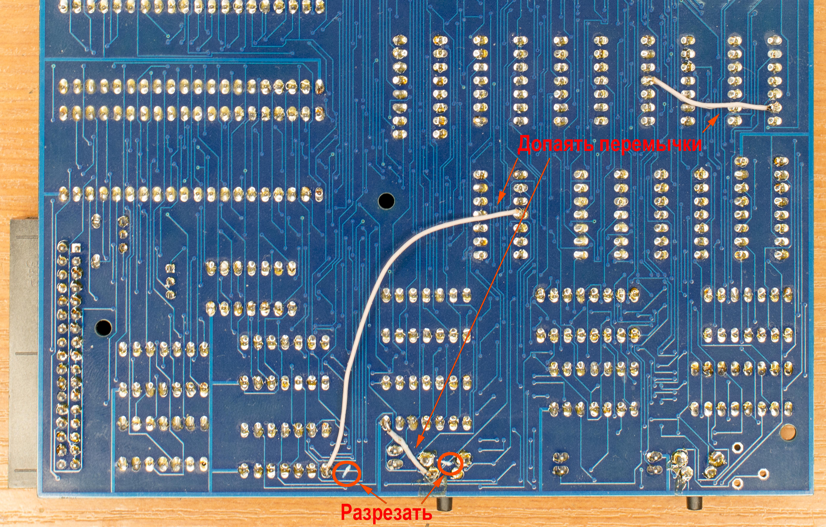 На верхней стороне платы нужно разрезать проводник, который проходит под микросхемой DD21 (ЛП8). Очень неудобно. В моём случае удалось сбоку между 13-м и 14-м выводами просунуть острый пинцет и перерезать дорожку: