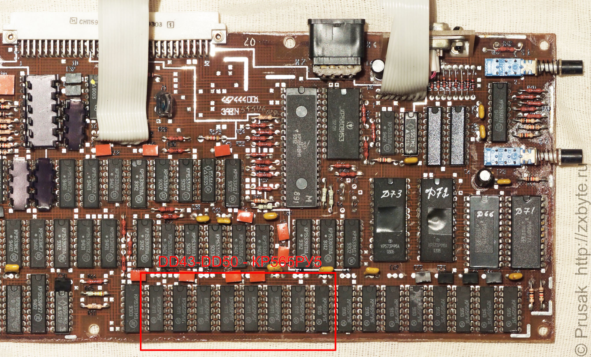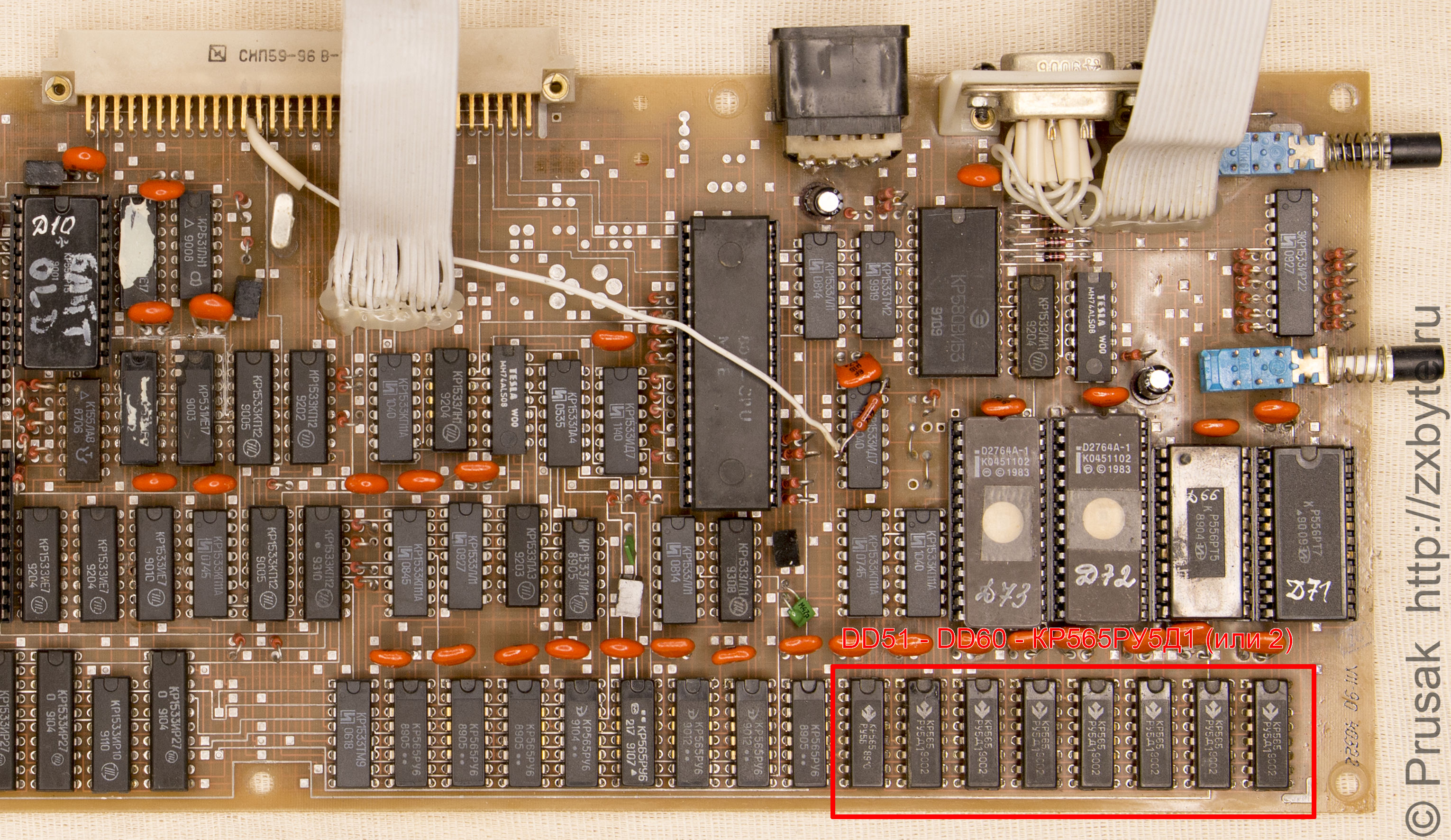 Первым делом следует определиться какие микросхемы ОЗУ установлены в вашем компьютере. Разбираем компьютер и смотрим на плату. Для начала убедимся, что микросхемы DD51-DD54,DD57-DD60 установлены типа КР565РУ5. Смотрим вот в эту часть платы: