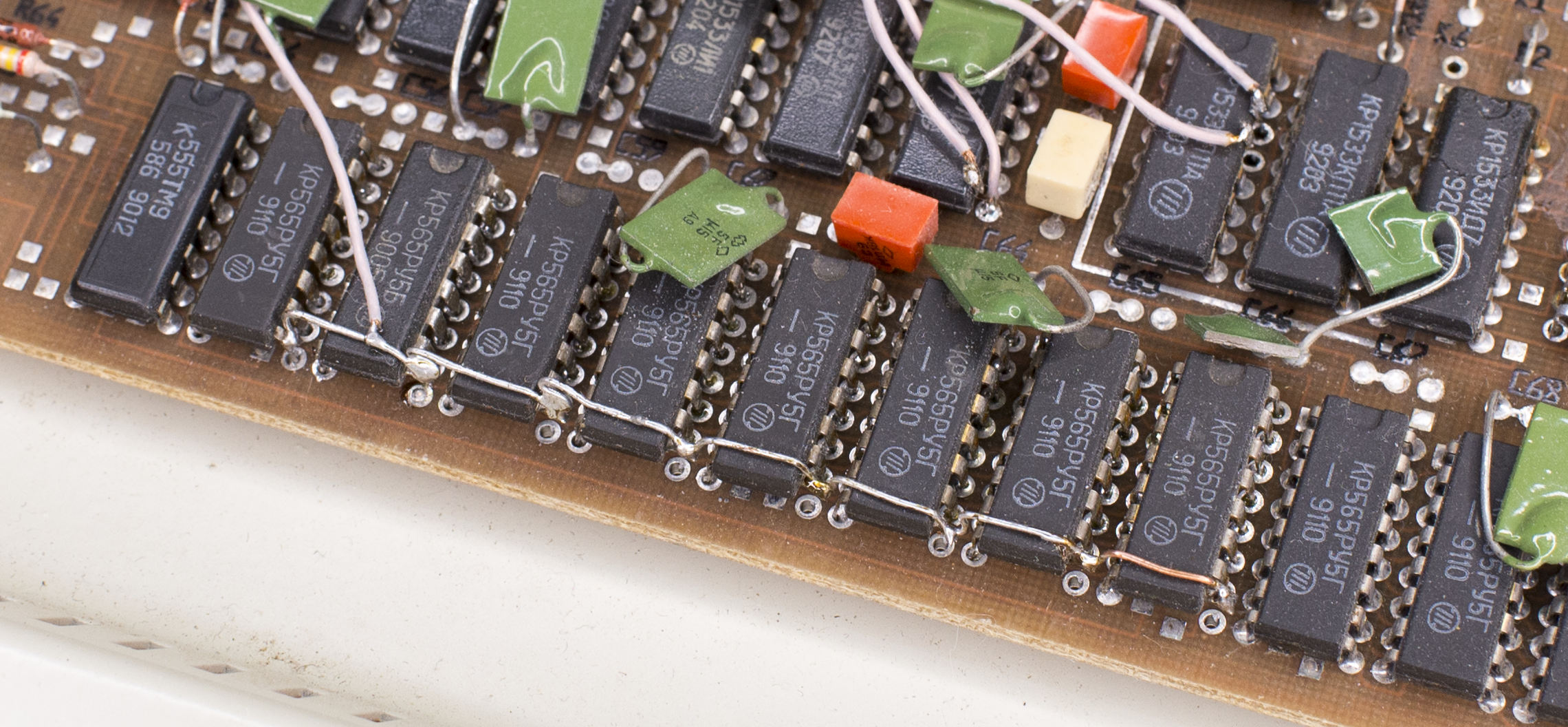 Что тут ещё может оказаться? Если у вас «старая» модификация компьютера «Байт», в нём скорее всего эта линейка памяти будет собрана из «половинок» КР565РУ5 под названием КР565РУ5Д1 или КР565РУ5Д2: