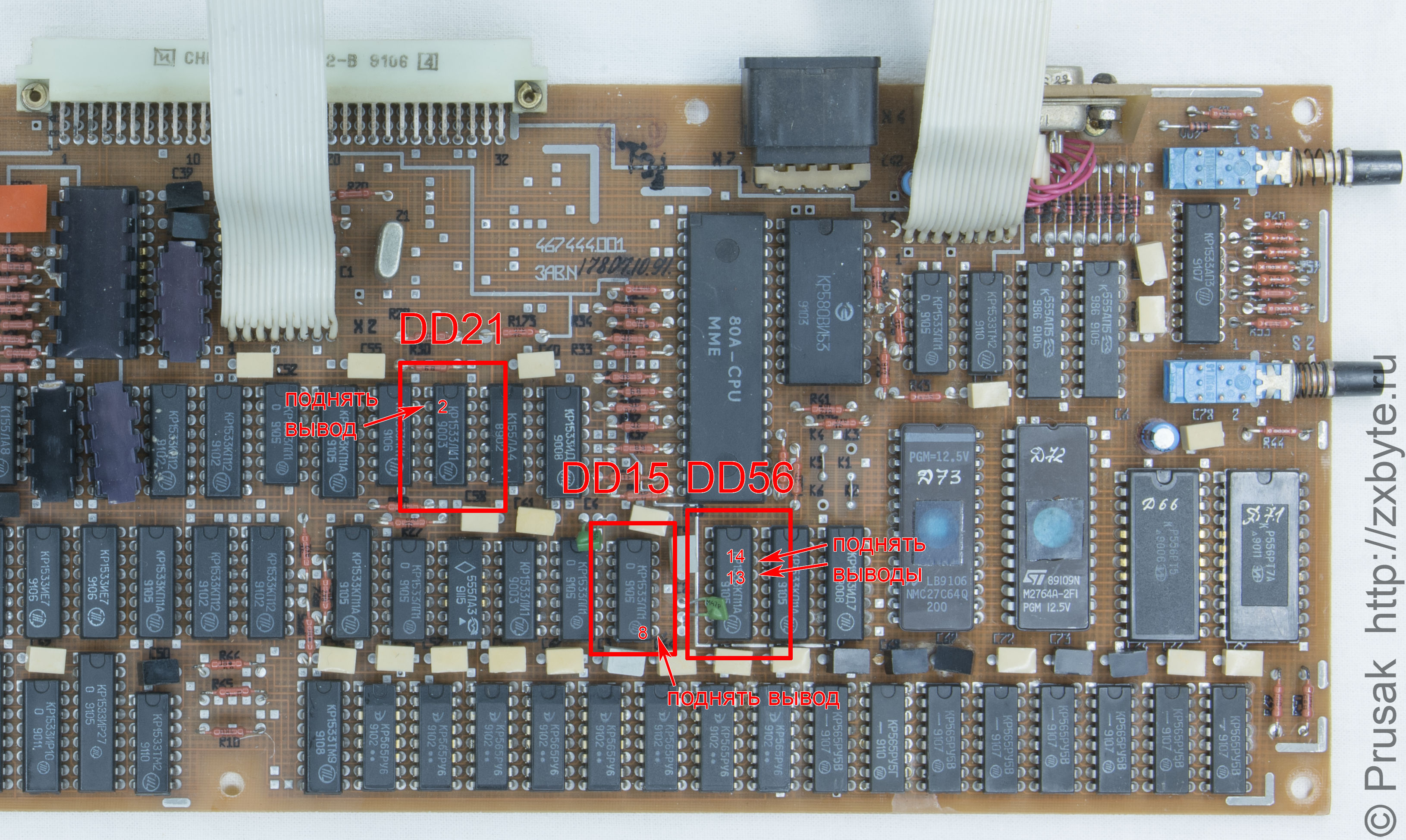 АККУРАТНО выпаять и поднять вверх следующие выводы микросхем: 13 и 14 у DD56 (КП11), 8-й вывод DD15 (ЛЛ1), 2-й вывод DD21 (ЛИ1):