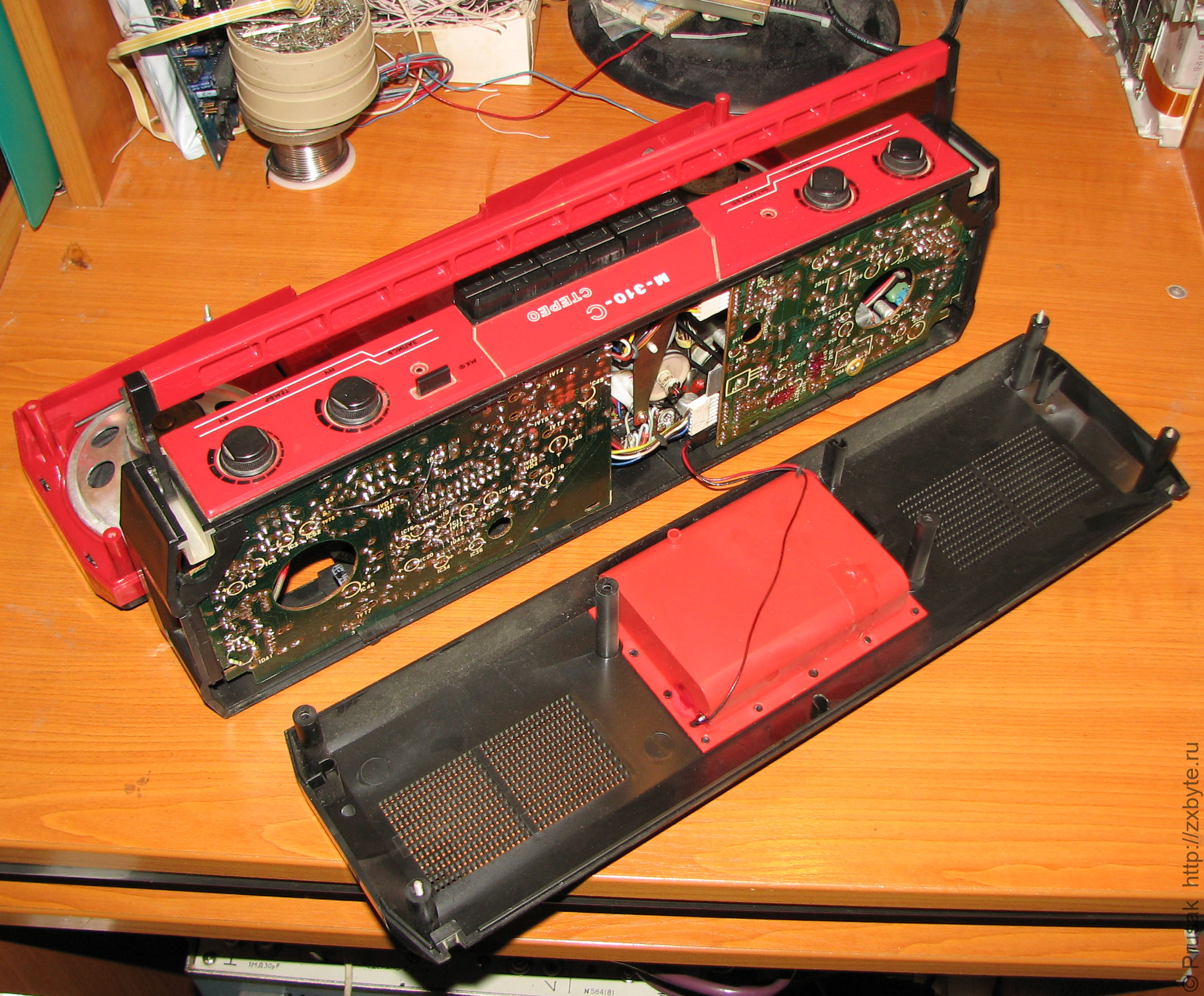 Магнитофон имеет раскладывающуюся конструкцию. Т.е. после откручивания шести саморезов, скрепляющих корпус, магнитофон "распадается" на три части - переднюю панель, среднюю часть с платами и ЛПМ и заднюю крышку с батарейным отсеком.