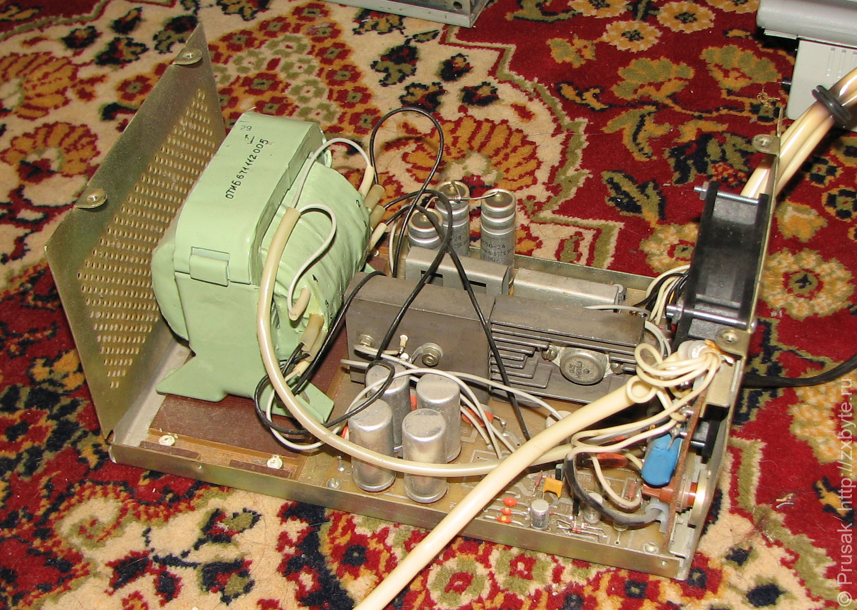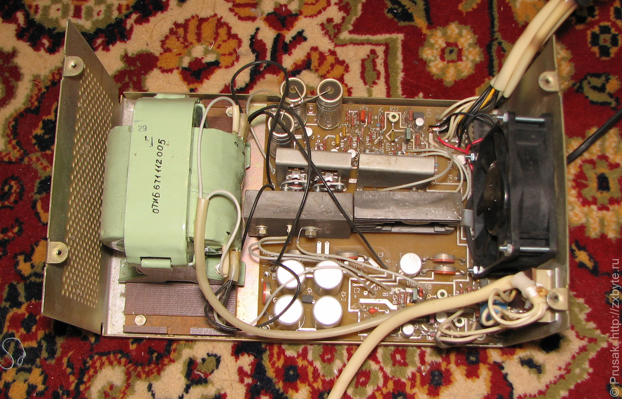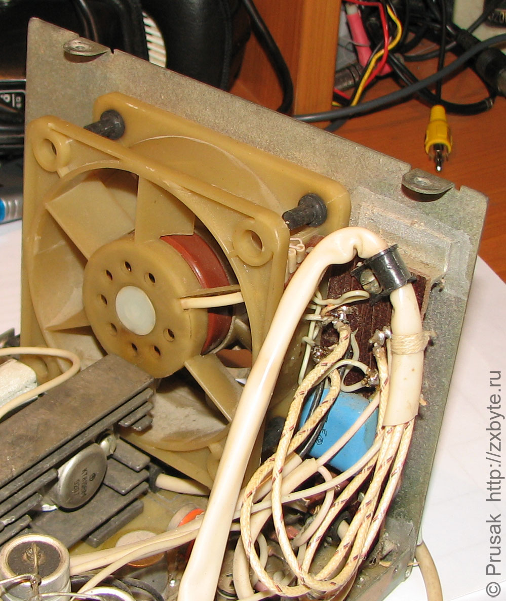 Вентилятор такого же типа, как в ЕС-1841 и довольно сильно гремит, поэтому при первой же возможности был заменен на 12-вольтовый тихий экземпляр. На первых фото блока питания установлен именно 12-вольтовый вентилятор.