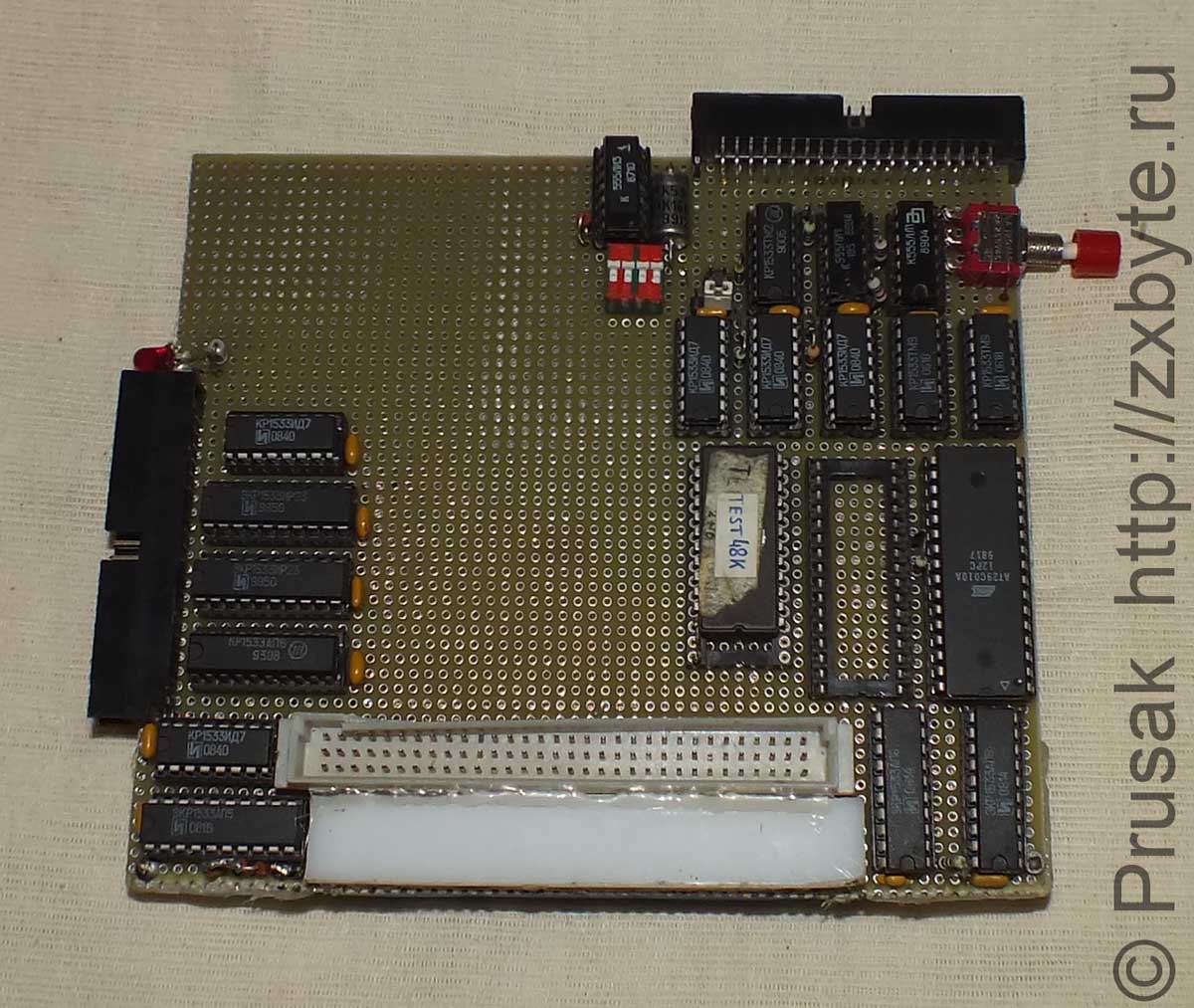 Я не использовал ПЗУ 27512 с прошивкой TR-DOS, потому что ПЗУ с TR-DOS уже установлено в контроллере дисковода для «Байта». Сам контроллер дисковода устанавливается отдельно в системный разъём на тестовой плате, где собрано расширение.