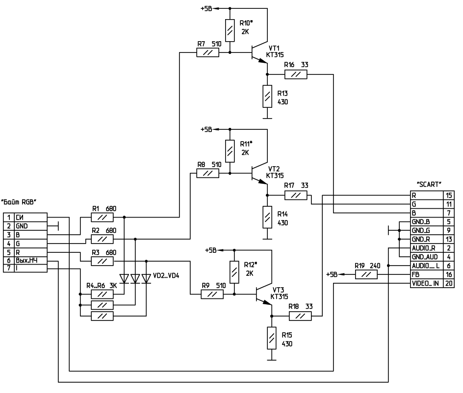 Также можно ввести согласующий каскад на транзисторе - эмиттерный повторитель, который имеет низкое выходное сопротивление, и поэтому отлично работает с низким входным сопротивлением входов SCART в телевизоре. Само собой разумеется, согласующий каскад потребуется поставить на каждый сигнал - R,G,B! Смотрим следующую схему: