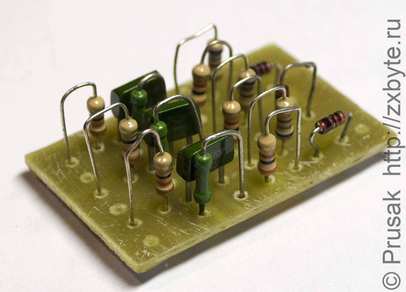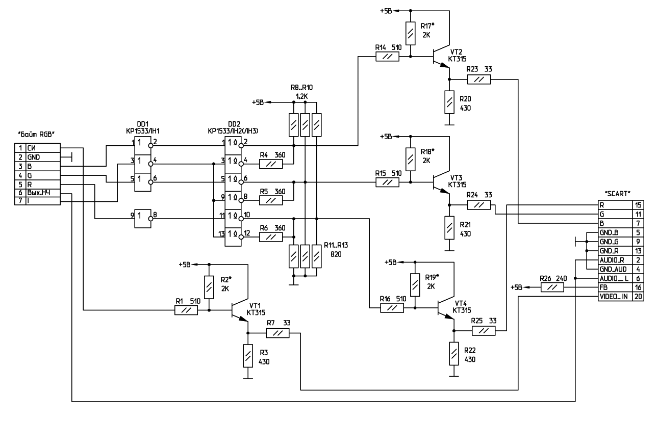 Перейдём от теории к практике. Можно превратить Байт в "обычный" Спектрум в плане организации видеовыхода. А именно поставить внутрь компьютера схему формирования сигналов RGB с градациями яркости. Схема платы: