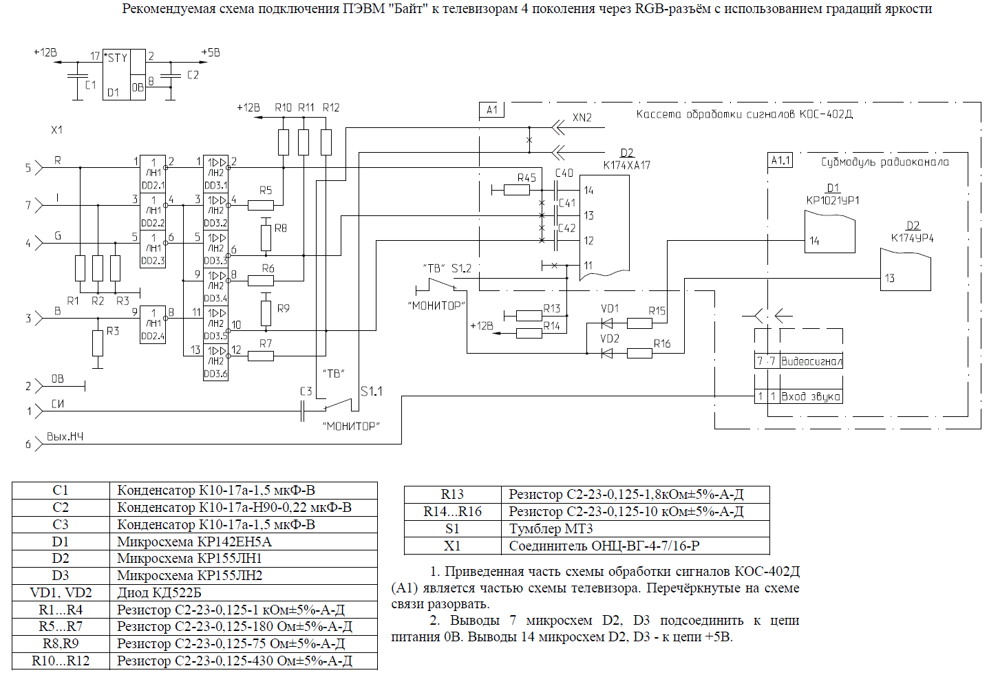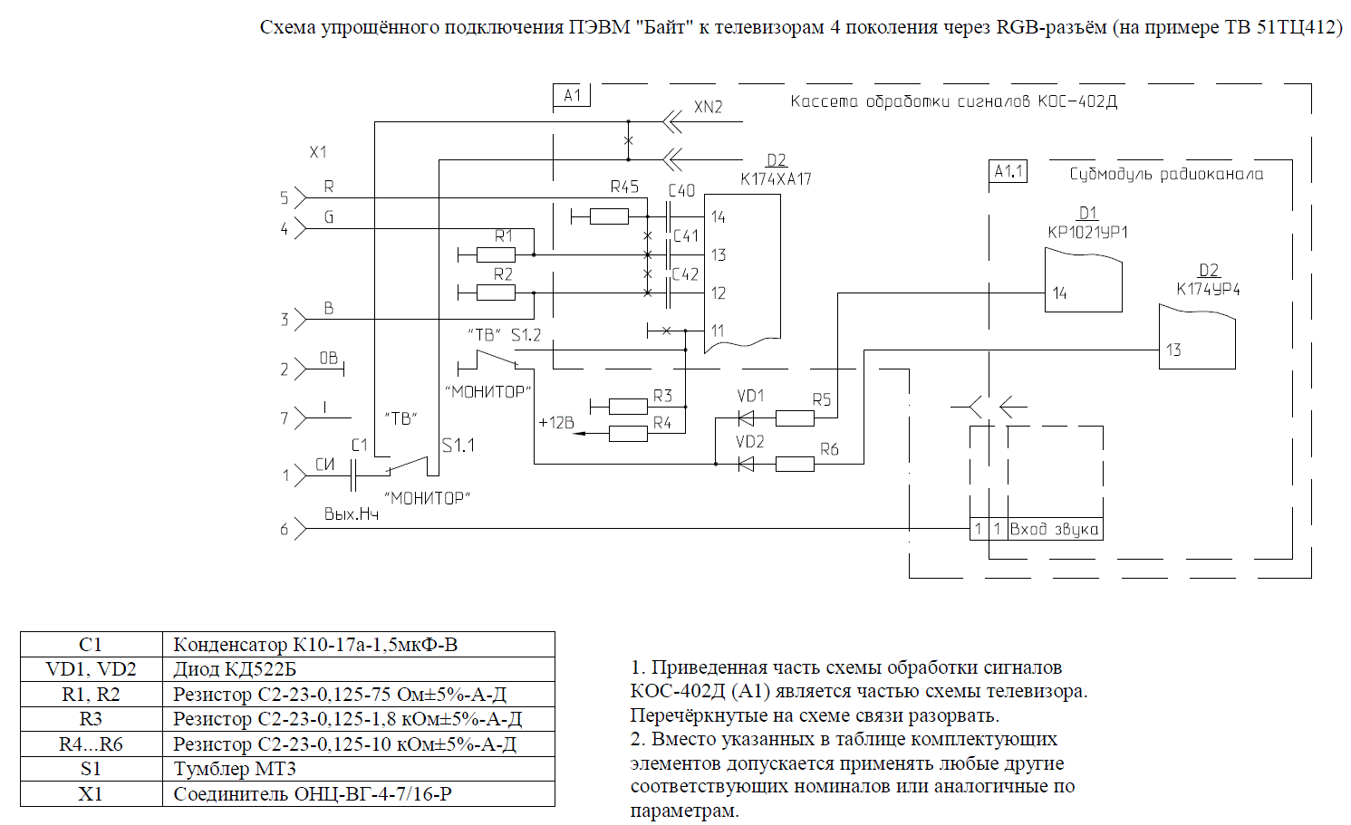 Схема подключения ″Байта″ к телевизорам 4-го поколения 4УСЦТ по упрощённой схеме без учёта яркостного сигнала