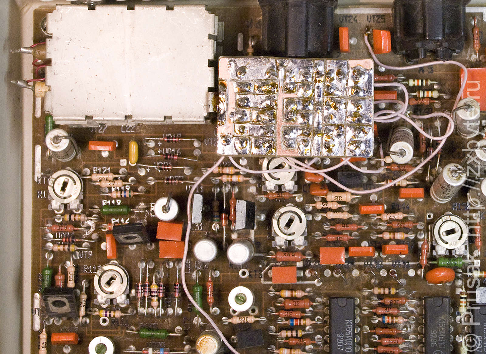 Плату можно припаять к верхней крышке ВЧ-модулятора - отогнуть от неё один лепесток и припаять плату к этому лепестку. У меня плата размещена следующим образом: