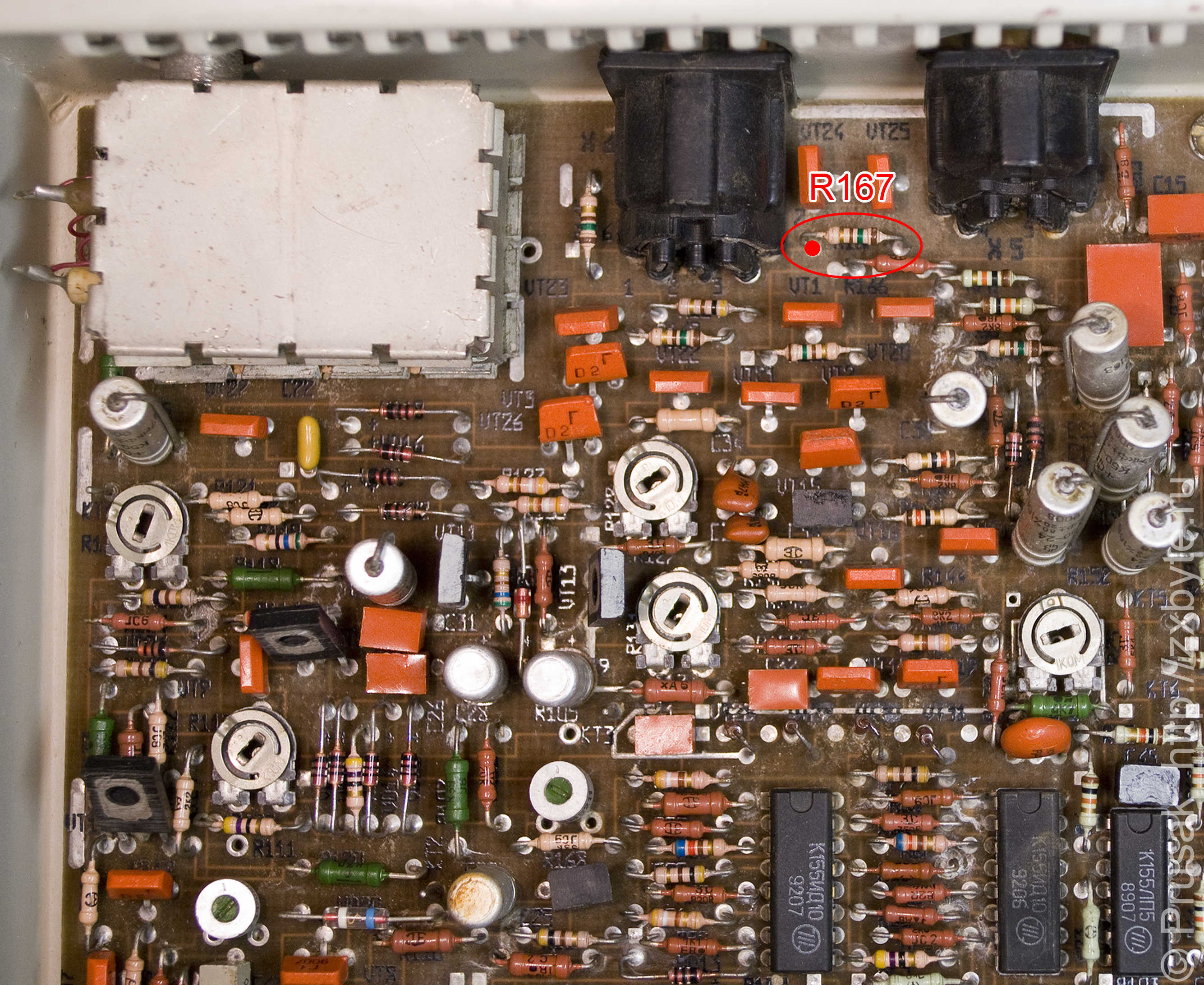 При таком способе доработки сигнал "BRIGHT" на 7-м контакте RGB-разъёма X6 становится ненужным. Если компьютер "Байт" планируется подключать к телевизору через SCART, то можно на 7-й контакт RGB разъёма вместо BRIGHT подать +5В для сигнала переключения телевизора в режим работы от RGB входа. Для этого необходимо отпаять резистор R167 и подать на контакт платы, обозначенный красной точкой, напряжение +5В: