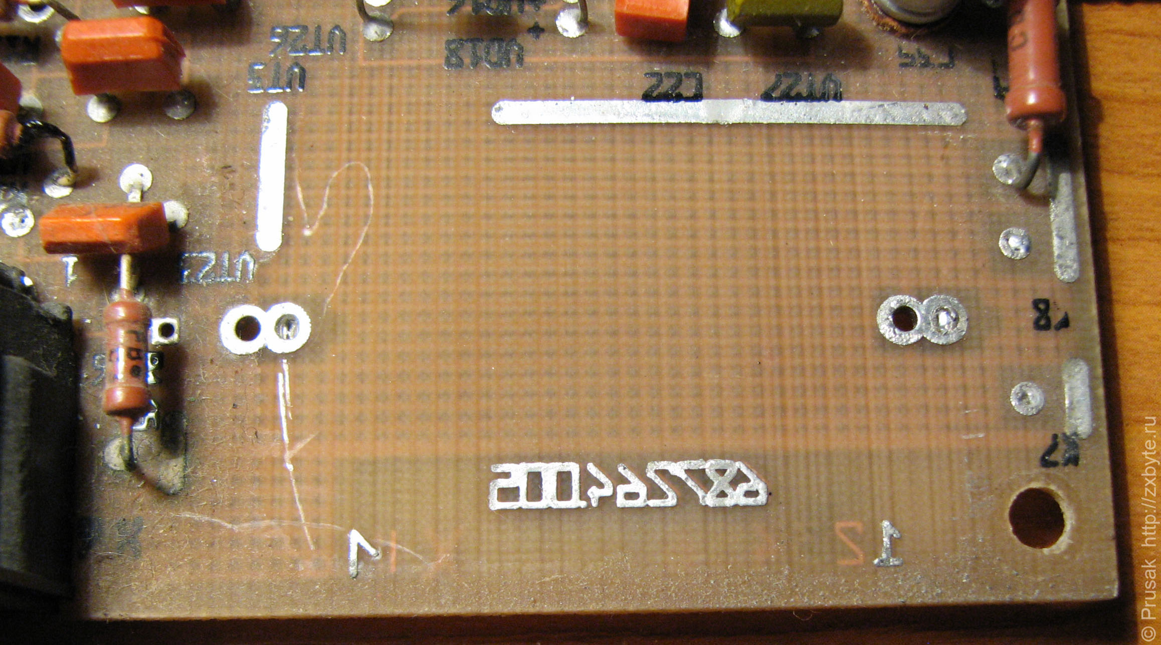 Плата компьютера состоит из восьми слоёв. Два слоя - это верх и низ платы, и 6 слоёв внутри. В подтверждение можно посмотреть на участок платы возле ВЧ-кодера. Слои нумеруются цифрами от 1 до 8 (на фотографиях ВЧ-кодер отпаян с платы для удобства съёмки):
