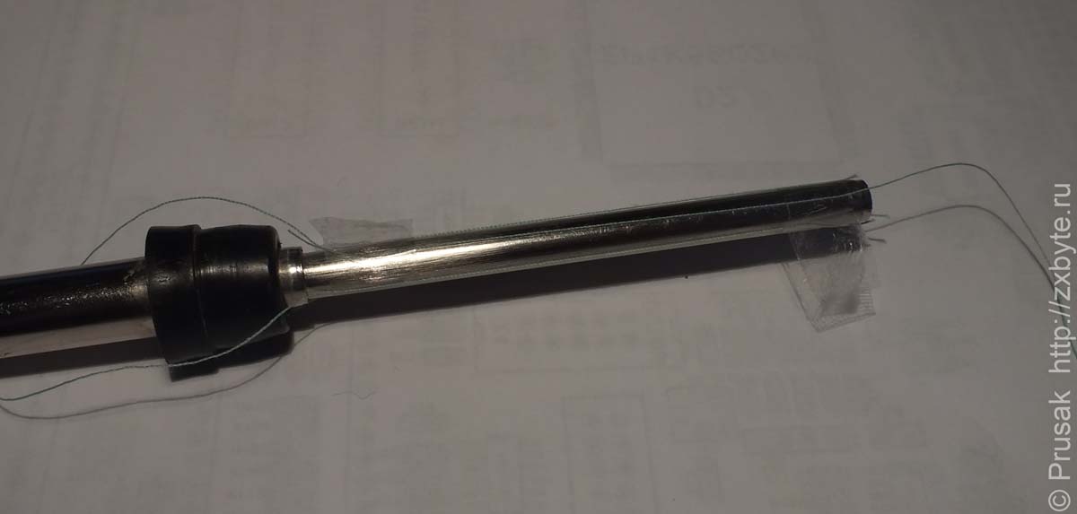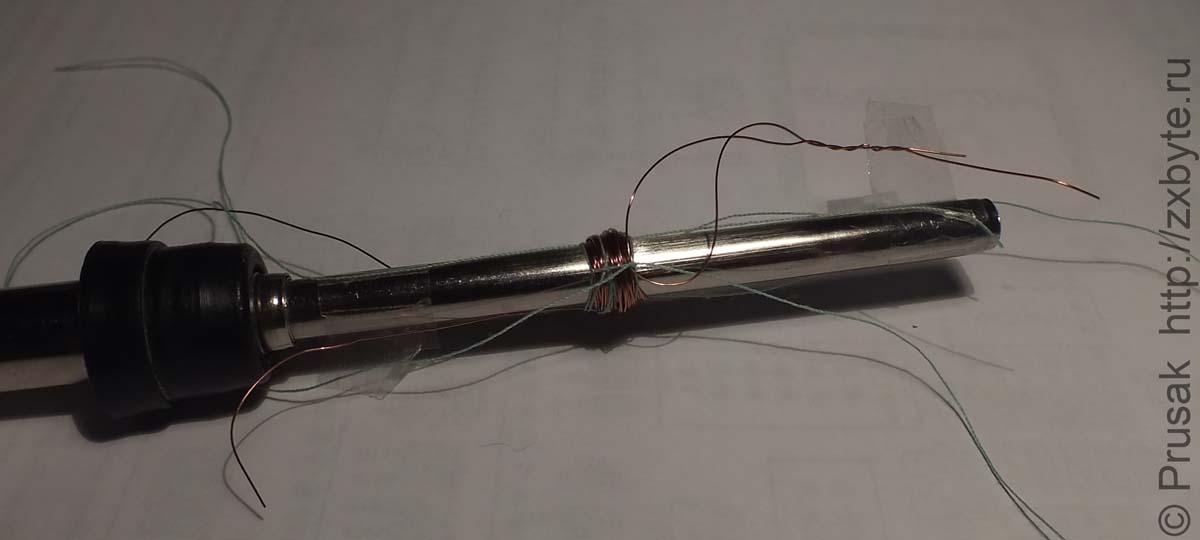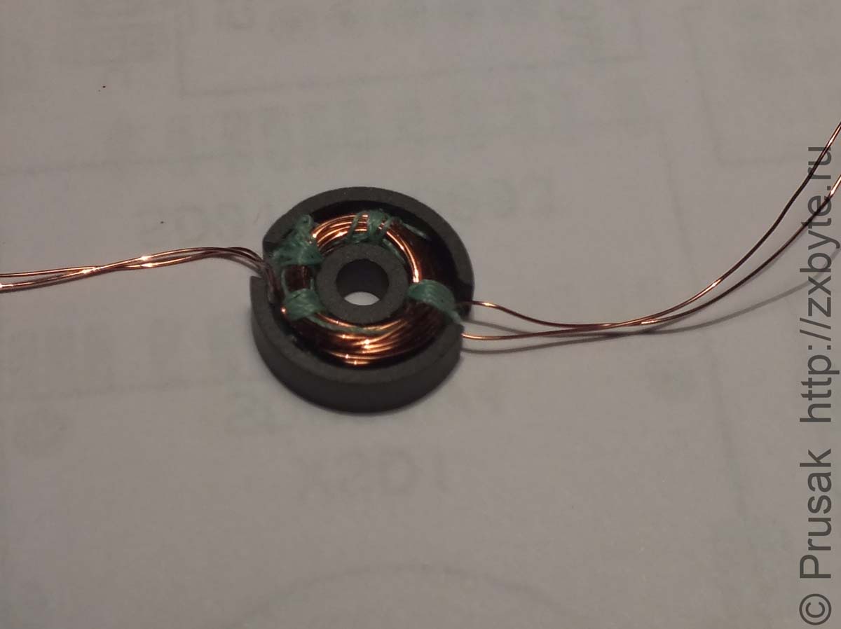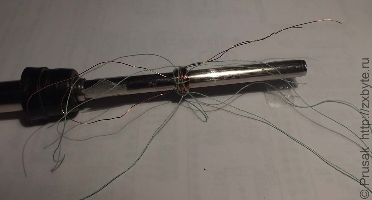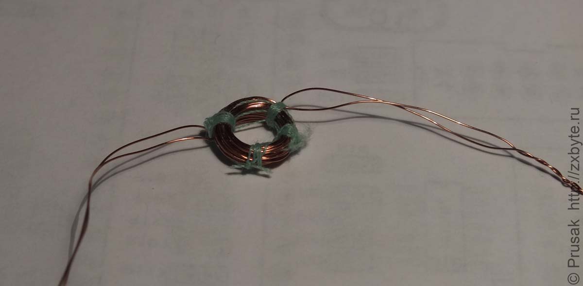 Мотаем первую катушку (пусть это будет обмотка №1, где 30 витков провода). После намотки фиксируем концы провода ниткой (обматываем отдельной ниткой катушку несколько раз), чтобы катушка потом сама не размоталась.