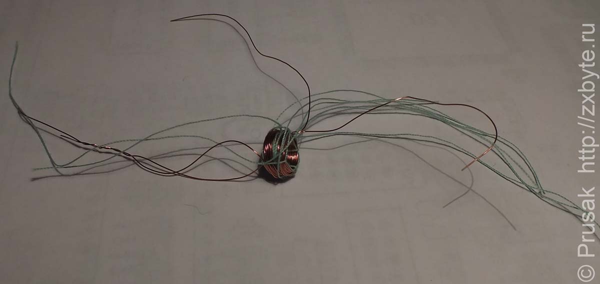 Поверх обмотки №1 мотаем обмотку №2, которая содержит 15 витков. При этом начинаем мотать так, чтобы концы проводов второй обмотки были диаметрально противоположны концам обмотки №1. Это необходимо для того, чтобы потом можно было пропустить концы каждой обмотки в свой паз в магнитопроводе. После намотки обмотки связываем её концы одной из ниток, которые мы крепили по поверхности оправки. Внимание - оставшиеся после завязывания узла концы нитки не обрезаем! Они нам понадобятся позже. Также советую как-нибудь отметить выводы этой катушки (например скрутить провода между собой), чтобы было ясно, что это обмотка №2, иначе потом мы никак не определим какие провода к какой обмотке относятся!