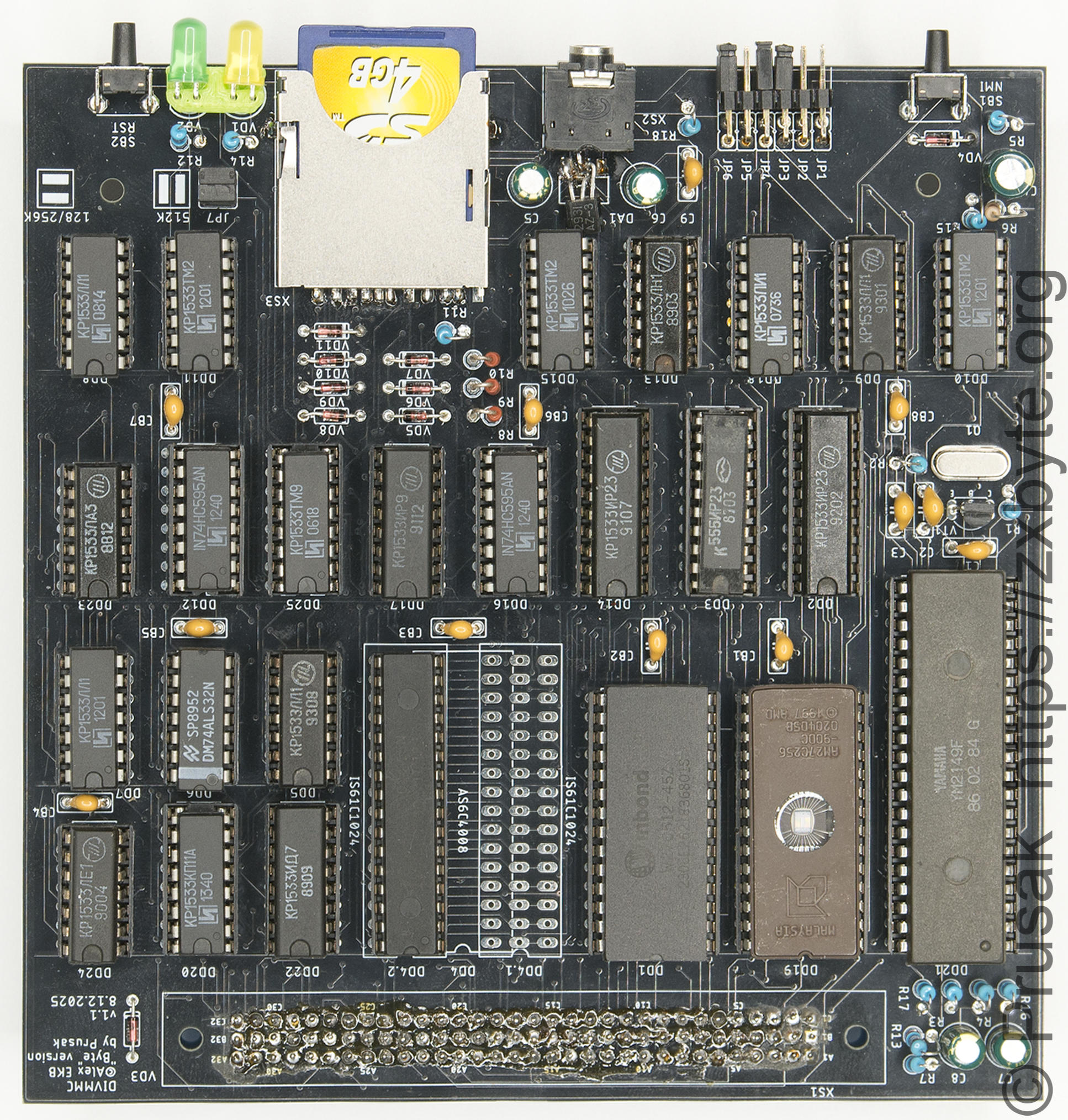 Кроме DivMMC на этой плате расположена схема расширения ОЗУ для компьютера «Байт» до 128К с музыкальным сопроцессором. Схема расширения ОЗУ работает отдельно от DivMMC и никак с ним не связана. Если вам не нужна расширенная память компьютера, вы можете не паять эту часть схемы (микросхемы DD20, DD21, DD22, DD24, DD25).