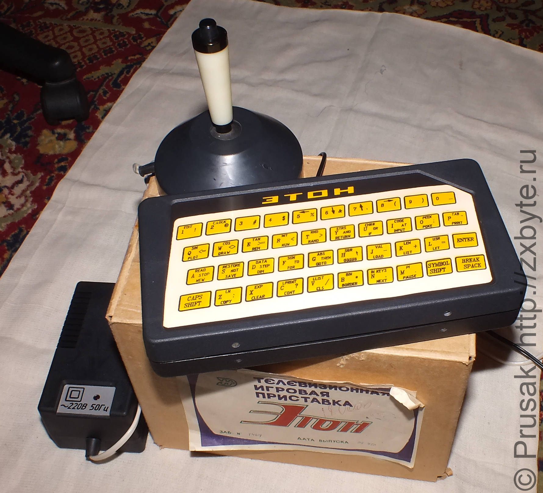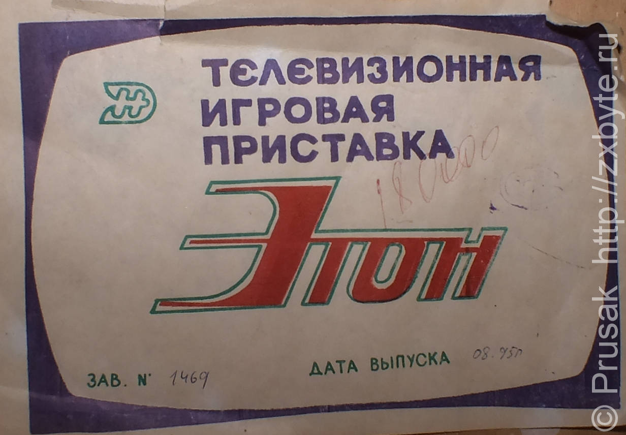 Первое, что бросается в глаза - это надпись «телевизионная игровая приставка». Кто не знает, может не понять, что это клон Спектрума. Дата выпуска - август 1995 года. Производитель - арендное предприятие «Этон», г. Новолукомль (Республика Беларусь).