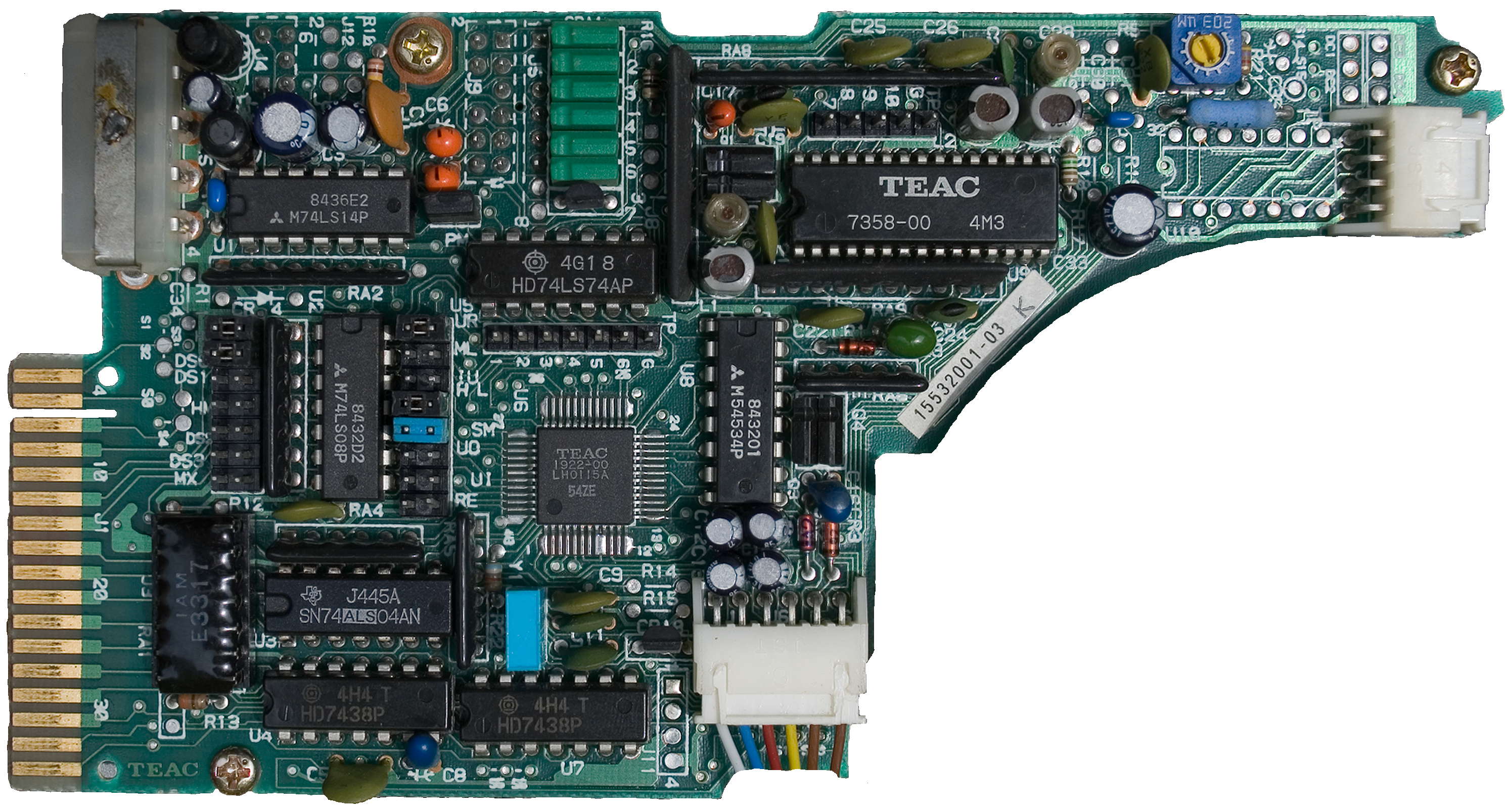 Насчёт этой платы у меня большие сомнения - это вообще-то плата контроллера от дисковода Robotron, и непонятно что она делает в накопителе Teac. Хотя известно, что в этой плате разводка разъёмов для подключения шагового двигателя, блока головок и т.п. одинакова с приводами Teac. Поэтому буду считать с большой натяжкой, что это плата от Teac.