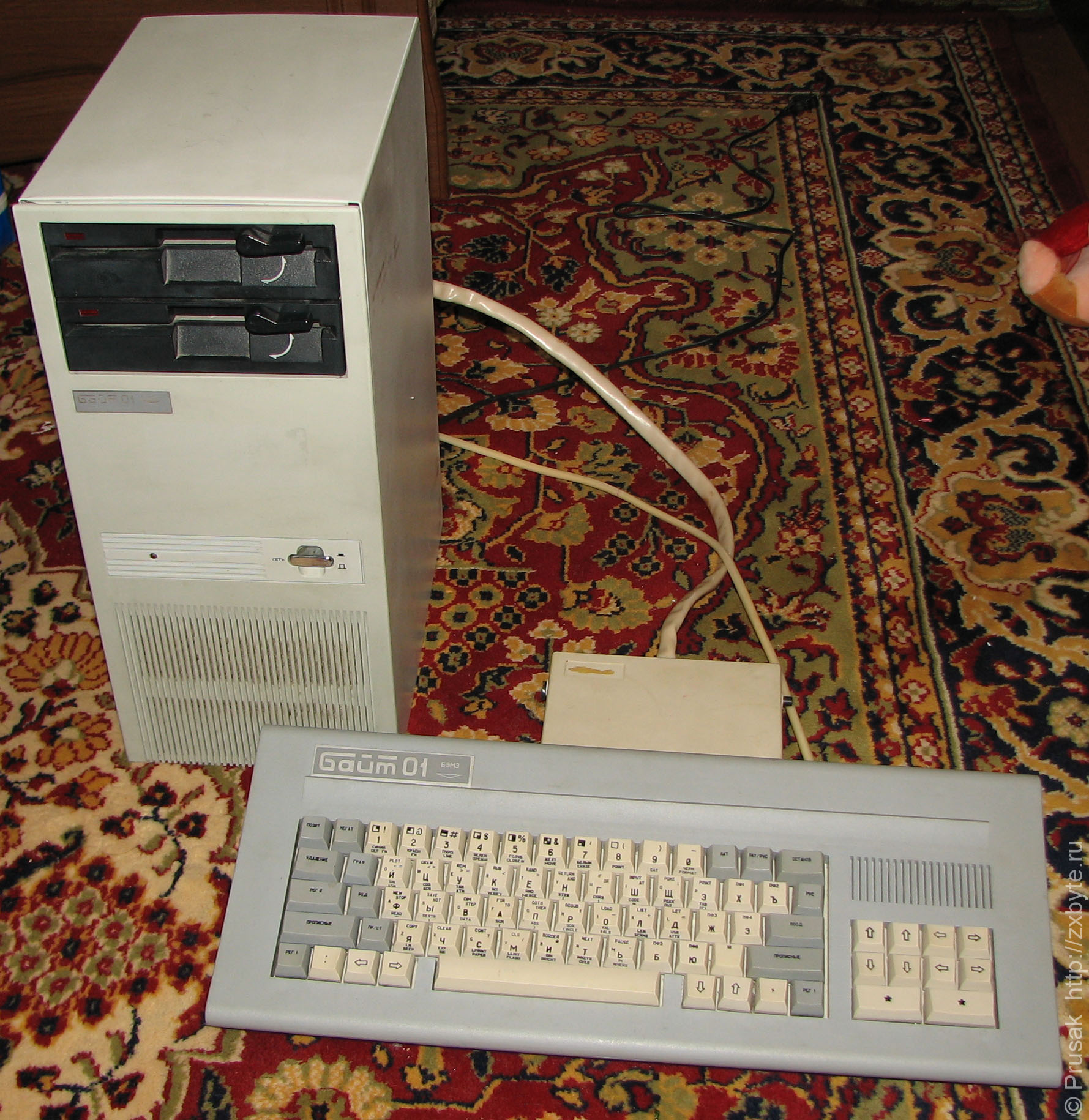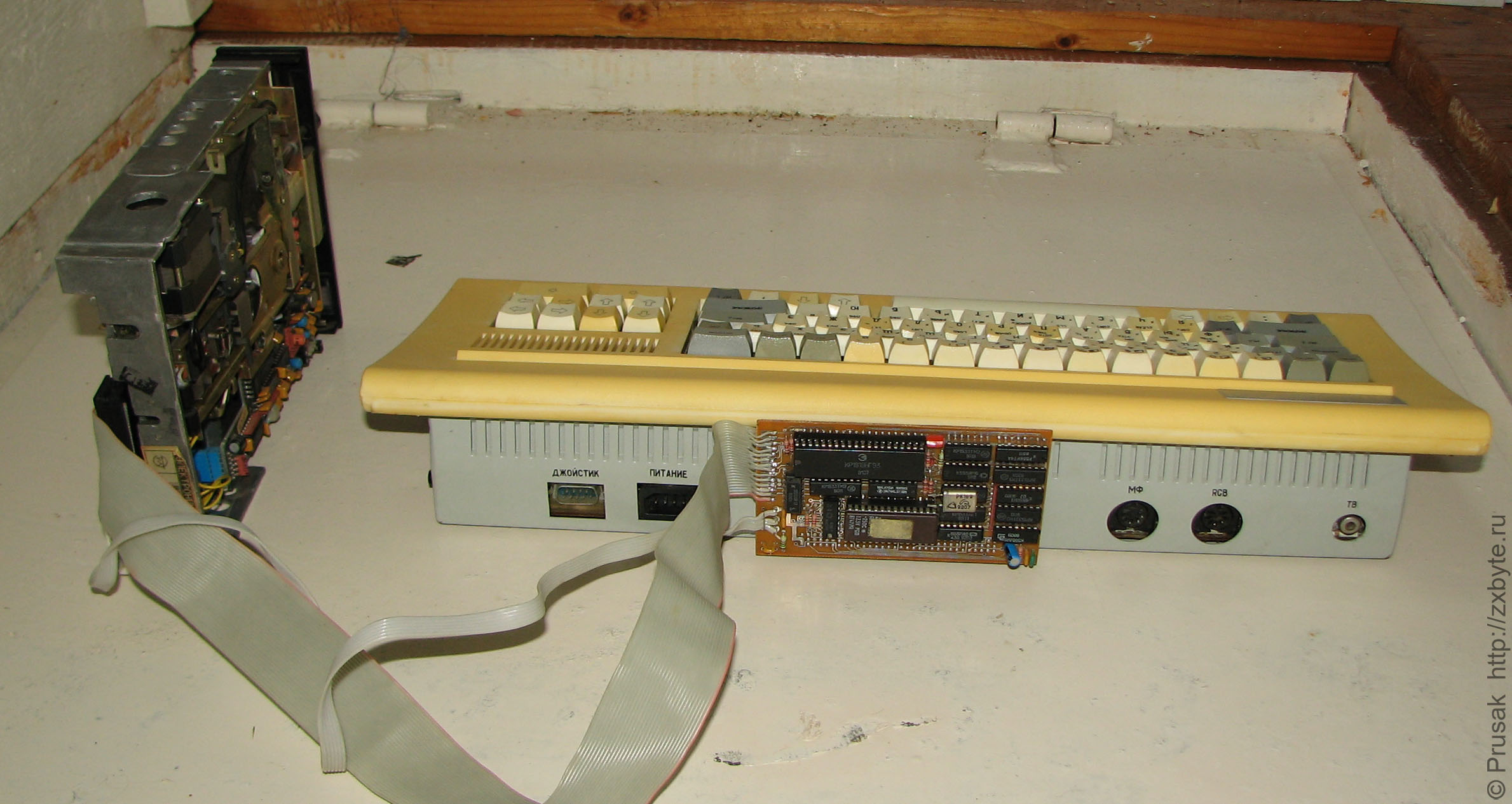 Однажды, году в 1995, придя в гости к знакомым, я увидел компьютер «Байт» с дисководом. В системный разъём компьютера просто вставлялась маленькая плата, к которой уже подключался дисковод. Выглядело всё примерно так: