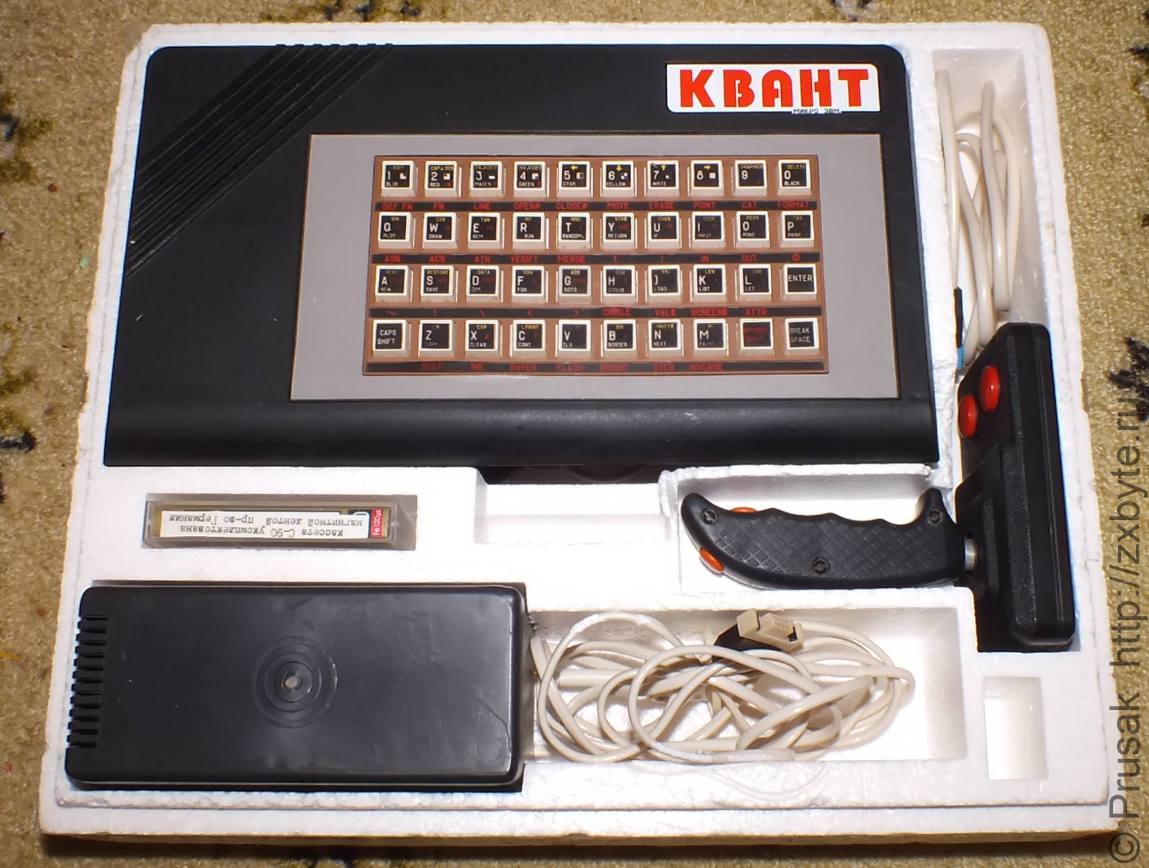 Как видно, комплектация стандартная для большинства клонов Спектрума - сам компьютер в скромном корпусе, 40-кнопочная клавиатура, источник питания, джойстик, шнуры, инструкция, кассета с несколькими играми. Коробка пенопластовая, что есть большой плюс в карму заводу-изготовителю, такие коробки куда удобнее обычных картонных.