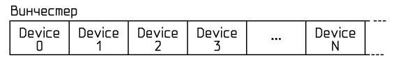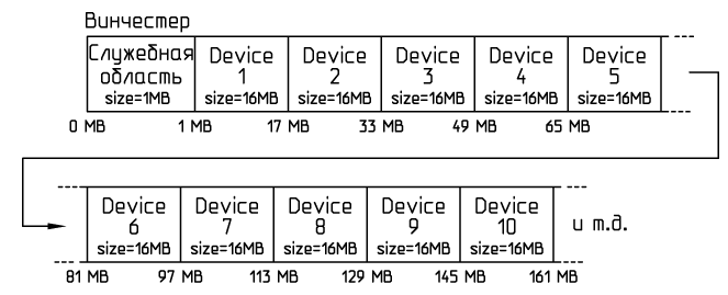 Под каждым устройством написан номер мегабайта относительно начала винчестера, с которого оно начинается. Список устройств можно продолжать и дальше, но для данного примера хватит и столько, сколько на рисунке.