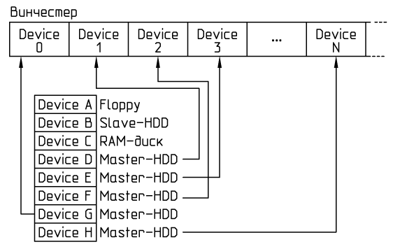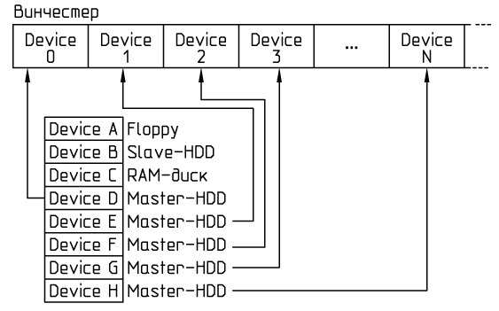 Так вот, к логическим устройствам системы можно подключить физические устройства на винчестере в разном порядке. К примеру, вот устройства, подключенные по порядку: