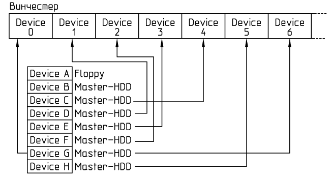 Для лучшего понимания посмотрим как на винчестере физически могут быть размещены устройства: