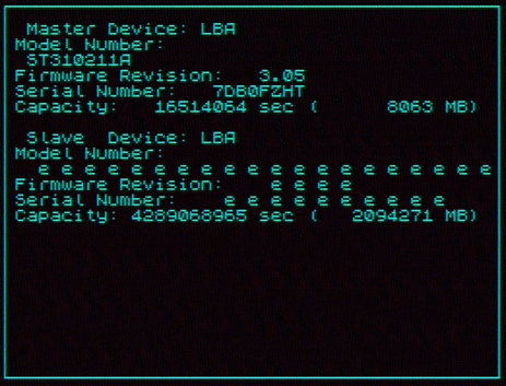 На "мусор", который показан в параметрах slave-устройства, можете не обращать внимание, это у меня такой винчестер, который "мусорит" на шину при обращении к slave-устройству. Нас же интересует параметр "LBA" для Master Device. Если там стоит "CHS", то такой винчестер не годится для работы (ему место скорее в музее или в коллекции хлама, нам он не нужен).
