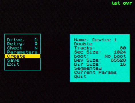 Настройки create.com для создания устройства можно брать такие, как на скриншоте. Имя устройства - как угодно, boot - обязательно ставить в "No boot", иначе программа не даст установить размер устройства 65528 блоков. Dir Size - лучше ставить чем больше. 16 блоков - это максимум. И параметр для Dir Size ставить Segmented. Подробности - в описании программы.