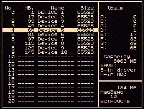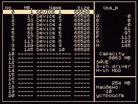 Следующий этап - создание таблицы размещения устройства на винчестере и сохранение её в служебной области (0-й мегабайт винчестера). Делать почти ничего не придётся - для этой рутинной работы уже есть программа, назвается lba_scan.com. Запускаем её, выбираем из списка найденных драйверов драйвер master-винчестера, и начинается процесс сканирования накопителя. Программа перебирает мегабайт за мегабайтом и при обнаружении устройства iS-DOS помещает номер начального мегабайта этого устройства в таблицу. Так как мы знаем, что создали 10 устройств, то после нахождения 10-го устройства можно остановить процесс сканирования клавишей "пробел", после чего программа покажет нам созданную таблицу:
