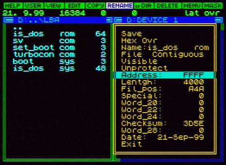 Для начала создадим где-нибудь отдельный каталог, куда будем копировать нужные для запуска системы файлы. Пусть он называется, к примеру, "LBA" (всё равно как вы его обзовёте - это никак не влияет на загрузку системы с винчестера). Скопируем туда следующие файлы: sv.com (он есть на системном диске iS-DOS), set_boot.com, turbocon.com и uniboot.sys. Затем файл uniboot.sys переименуйте в boot.sys. Сам же оригинал файла uniboot.sys сохраните где-нибудь, потому как после всех операций по загрузке системы с винчестера файл boot.sys будет недоступен для копирования! Ещё понадобится файл is_dos.rom. Его можно поискать в каталоге BOOT системного диска. Короче, думаю, что найдёте его. Теперь сохраним ядро системы в текущий каталог, вызвав утилиту sv.com, которую мы предварительно в текущий каталог уже скопировали. В итоге получим следующие файлы: