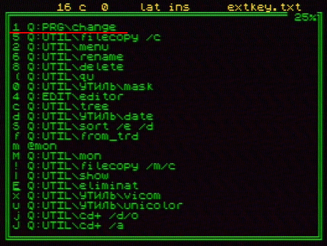 И вот теперь мы подошли к финальной стадии - сейчас мы будем получать доступ к любому из 10 устройств на винчестере. Для этого служит программа change.com. Её вызов нужно закрепить за какой-нибудь клавишей, так будет гораздо удобнее, чем вызывать каждый раз программу из командной строки. Откроем в текстовом редакторе файл extkey.txt (он находится в каталоге SHELL) и "забьём" вызов change.com за какой-нибудь неиспользуемой кнопкой: