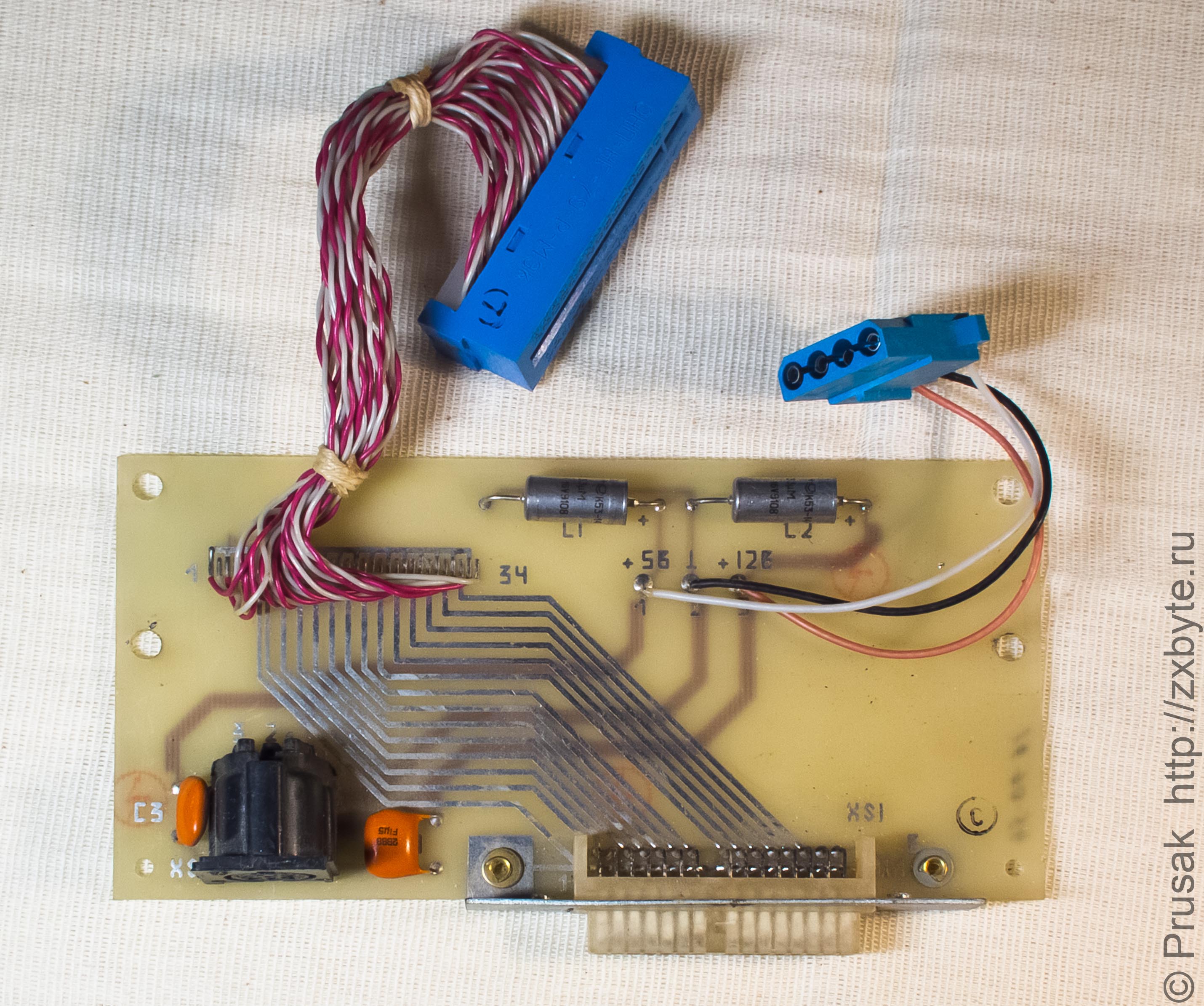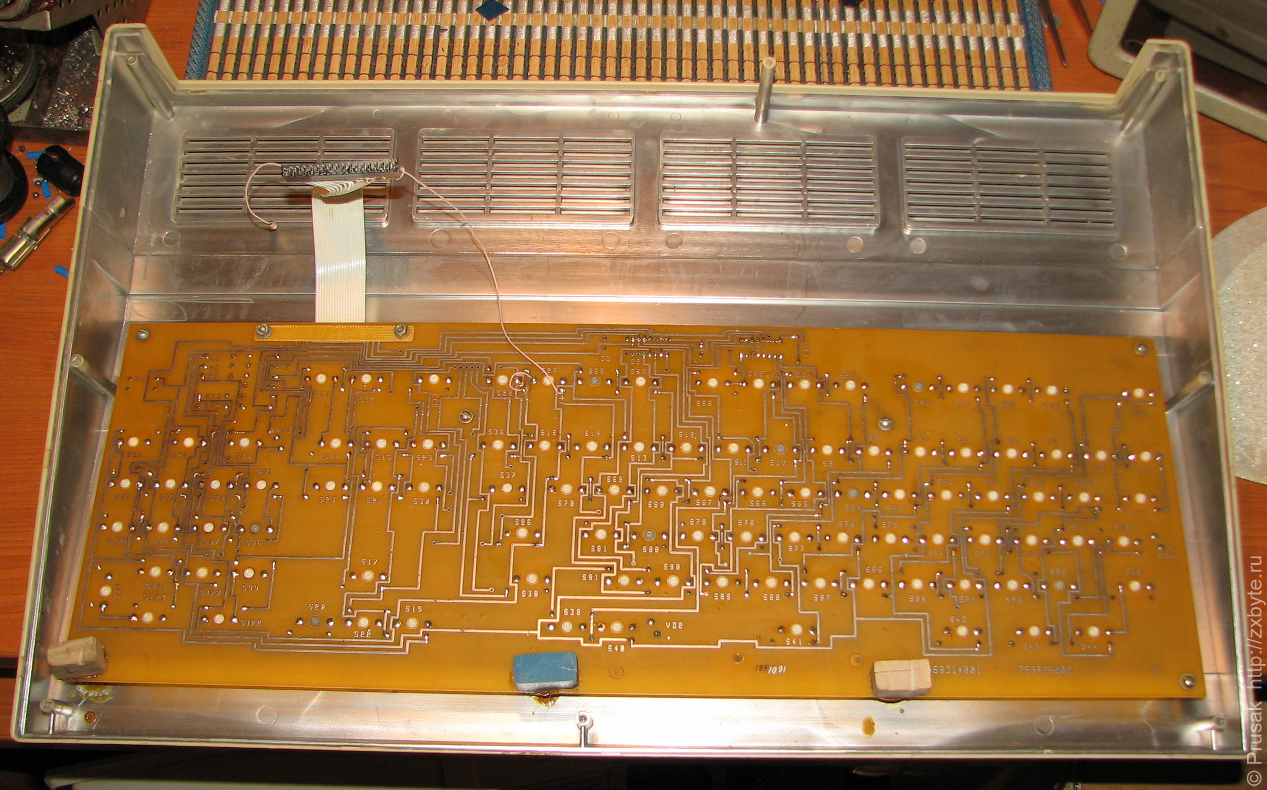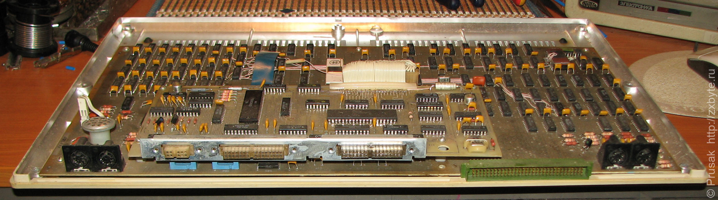 На фотографии выше "родной" шлейф дисковода с интерфейсным разъёмом заменен на кусок шлейфа от IBM PC. Сам дисковод (Teac) тоже не родной. Изначально там стоял МС-5311.