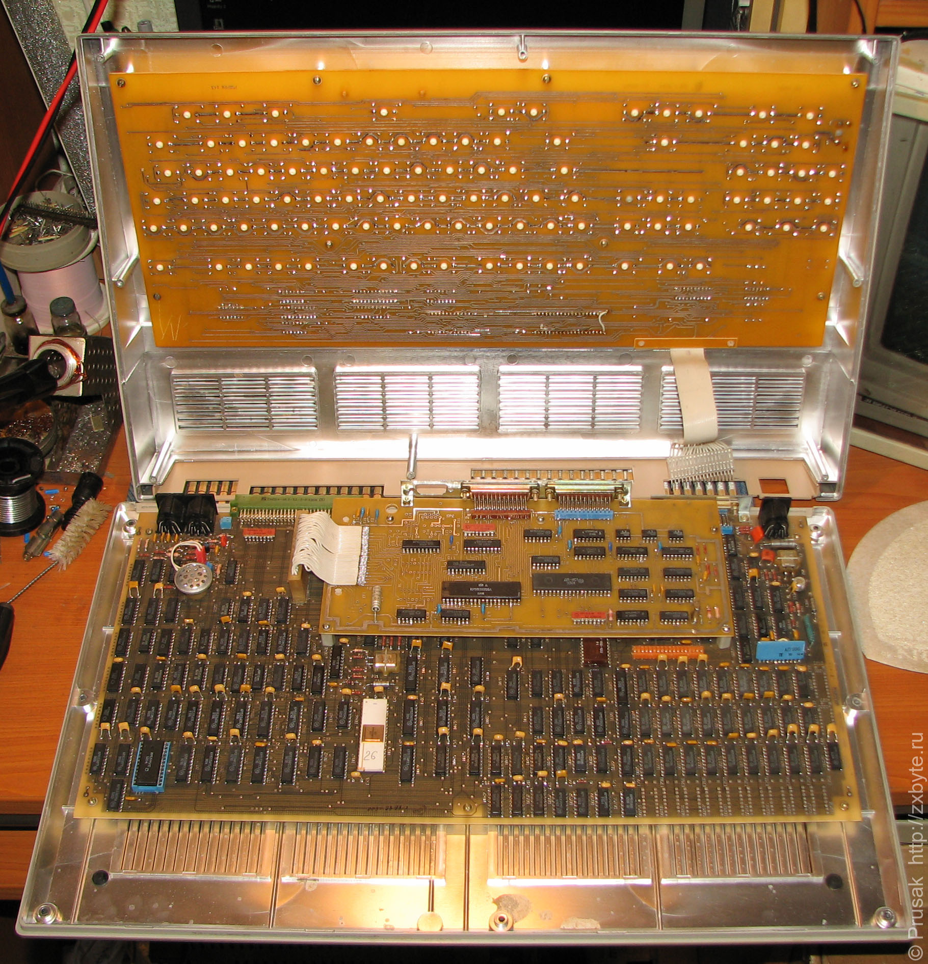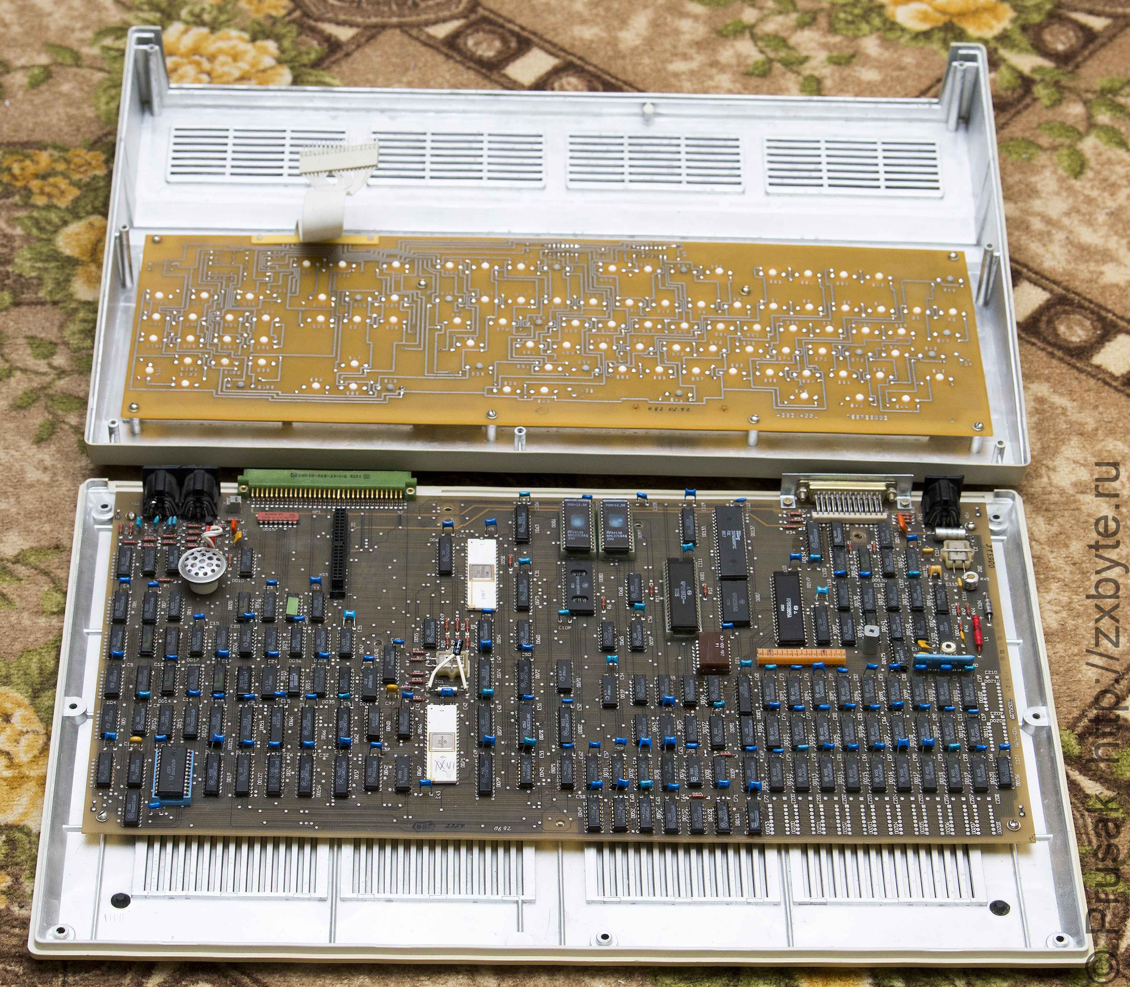 На корпусе компьютера написано, что это именно 02-е исполнение. Хотя по характеристикам не очень-то он подходит для исполнения 02. Объём оперативной памяти - 768К. Возможно дополнительная память была установлена уже после покупки (две линейки микросхем КР565РУ5 заменены на на КР565РУ7).