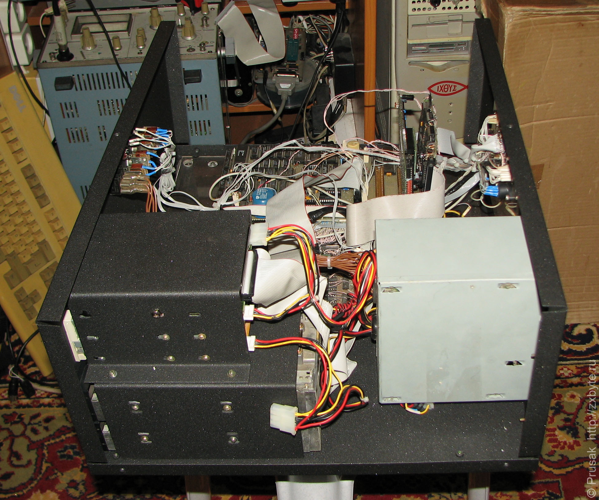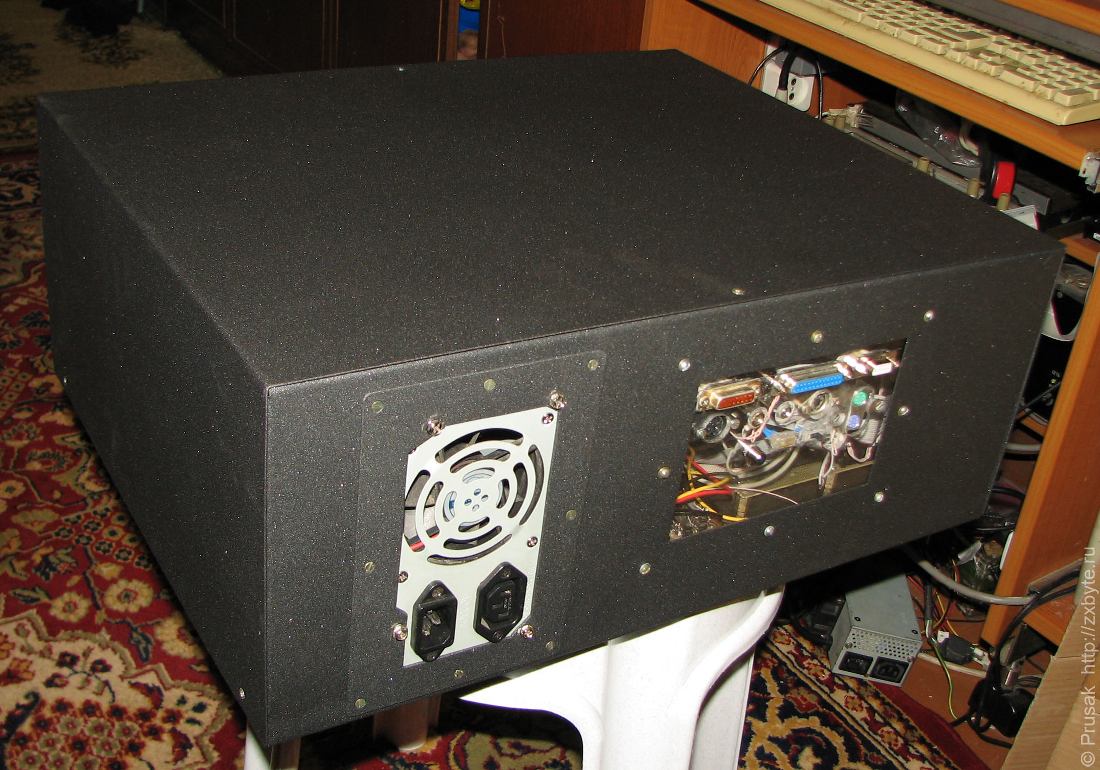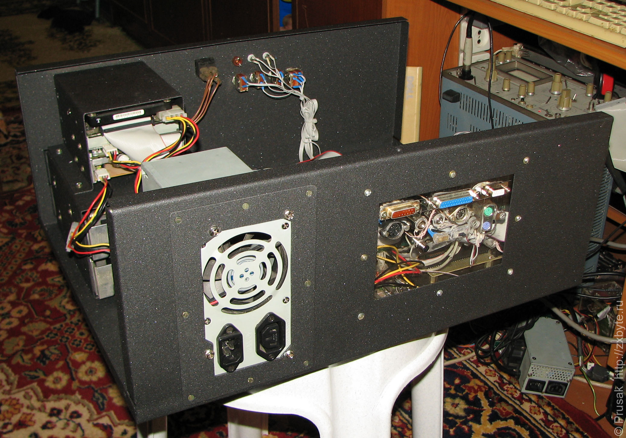 Всё это немного позже переместилось в специально разработанный для него металлический корпус форм-фактора типа «гроб» :) Корпус получился довольно большой, но зато в него помещаются помимо компьютера и блока питания 4 дисковода и винчестер.