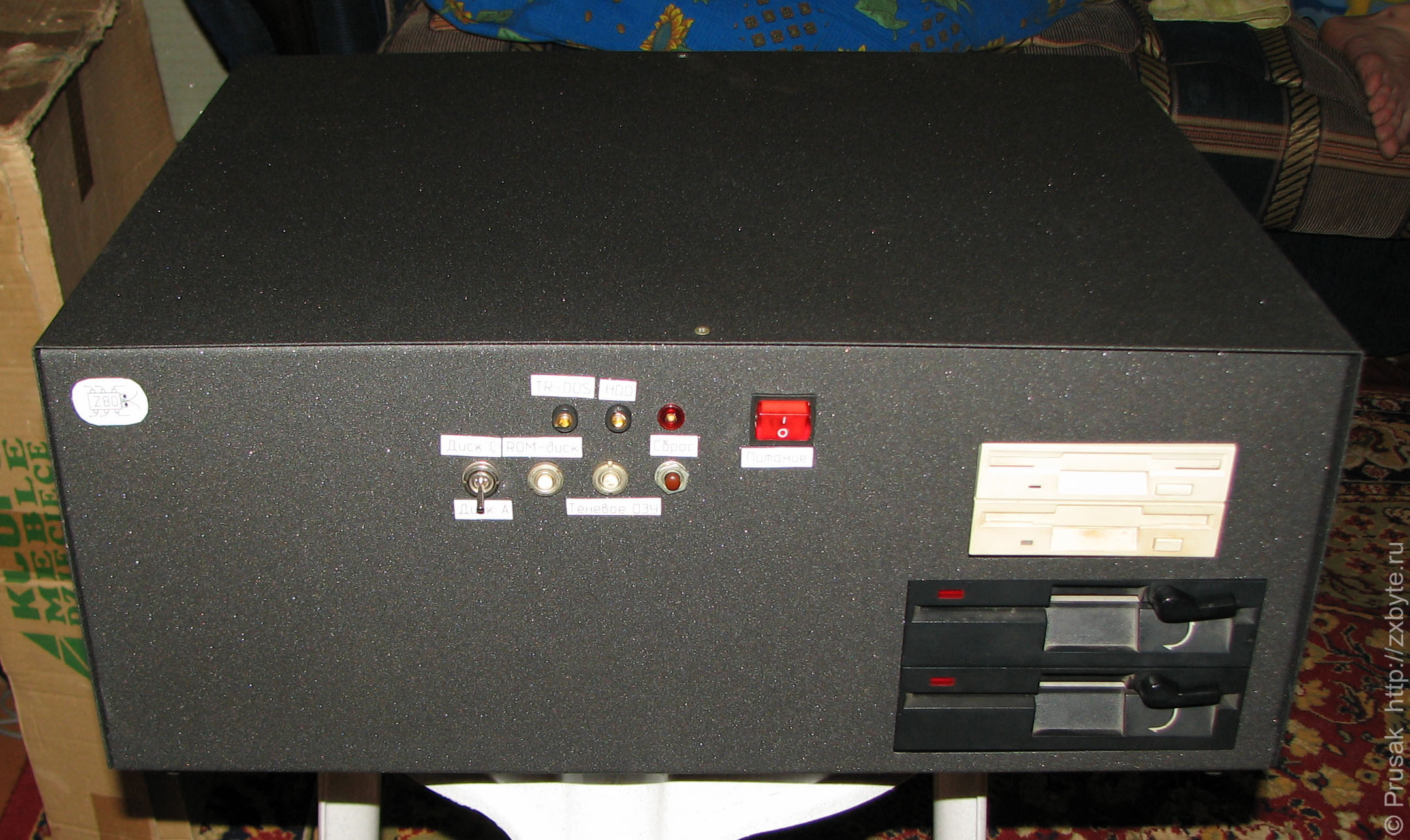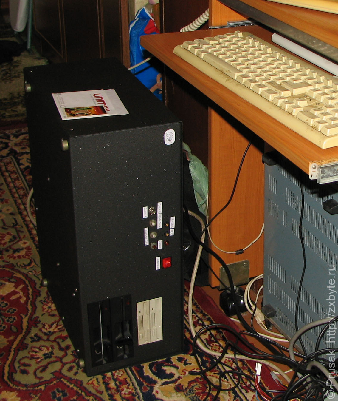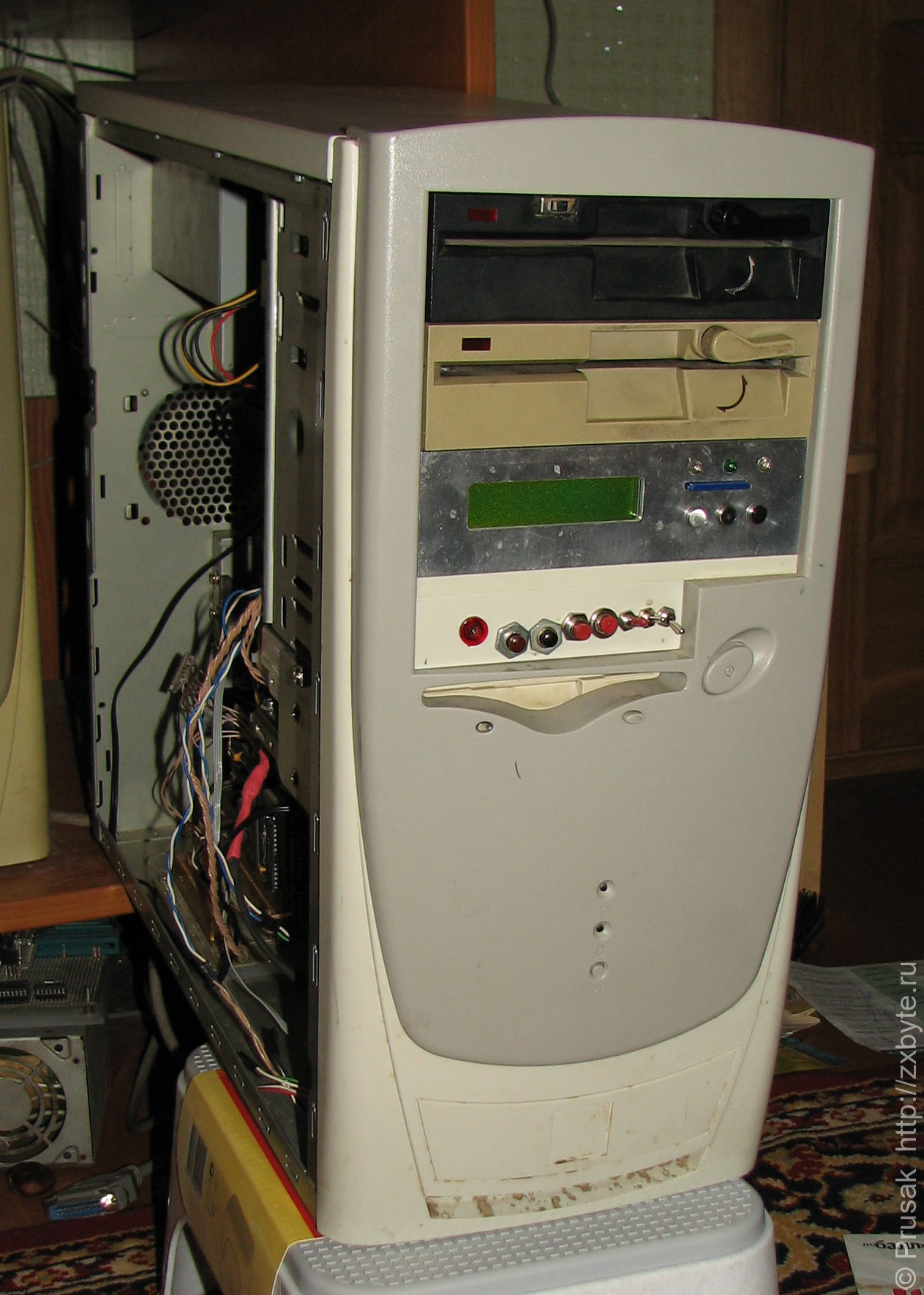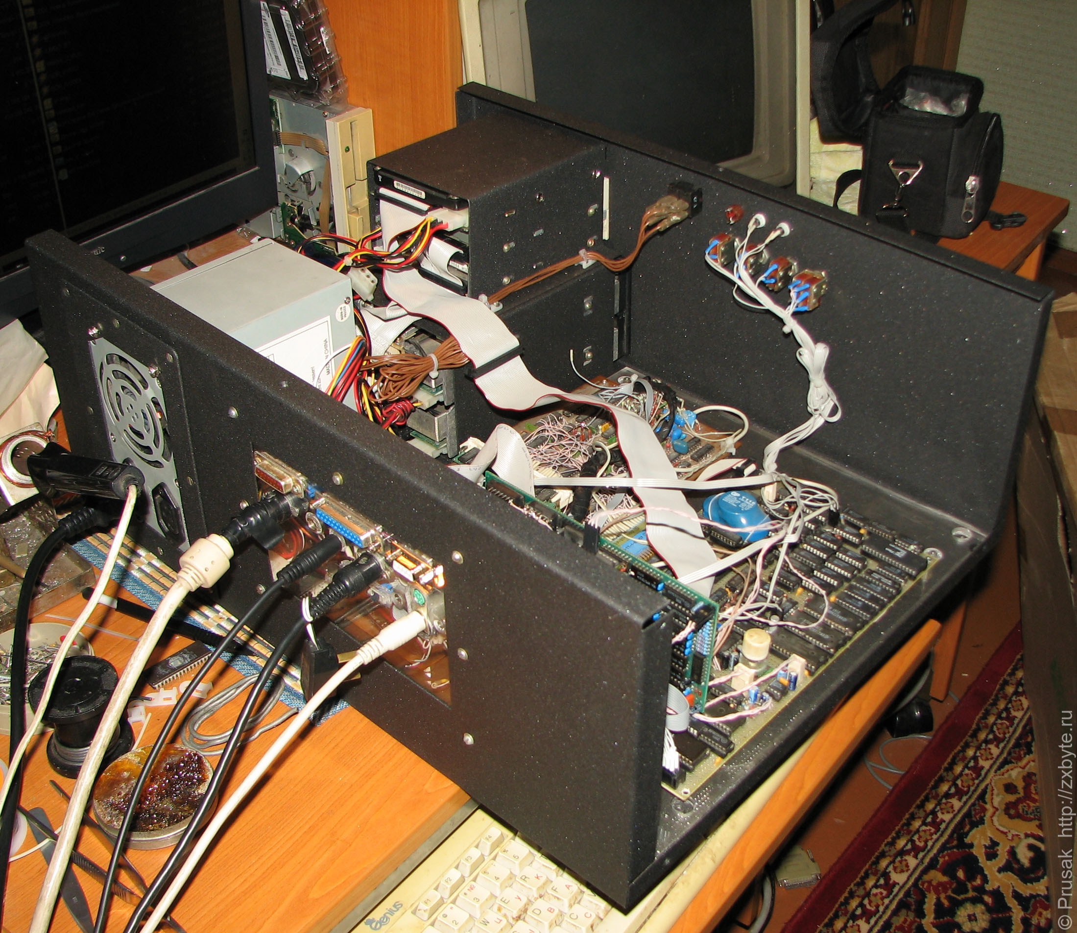 Всё это немного позже переместилось в специально разработанный для него металлический корпус форм-фактора типа «гроб» :) Корпус получился довольно большой, но зато в него помещаются помимо компьютера и блока питания 4 дисковода и винчестер.