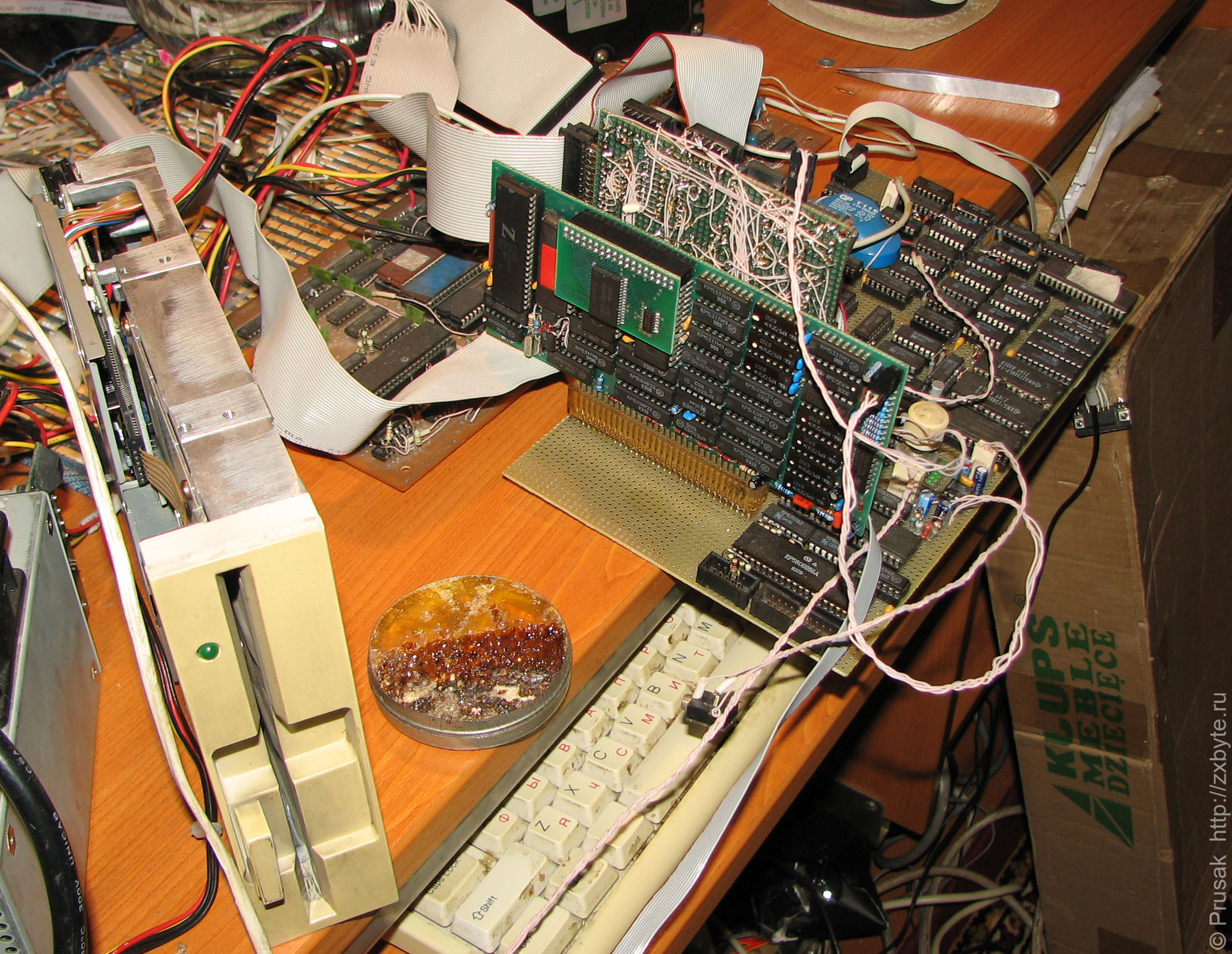 Долго оставаться без рабочего Spectrum′а не хотелось, и по случаю у CHRV был куплен АТМ-Турбо 2+ .Памятуя о недопустимости превращения компа в клубок МГТФа я свёл к минимуму число дополнительных паек на плате АТМки и вывел всю периферию на дополнительные платы. В итоге получился вполне такой симпатичный компьютер, на котором приятно работать: